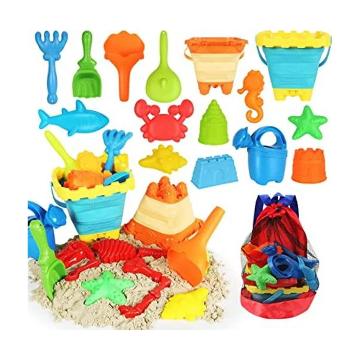 Elovien Juego de juguetes de arena de playa, 24 piezas de juguetes de arena con bolsa de malla incluida 2 cubos plegables, moldes de arena, palas, rastrillos y regadera, juguetes de verano al aire libre para niños y niñas