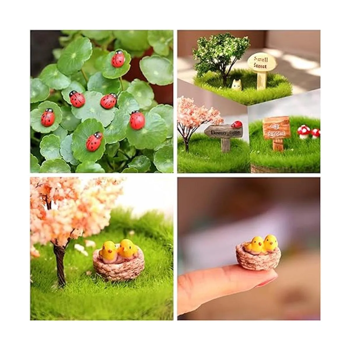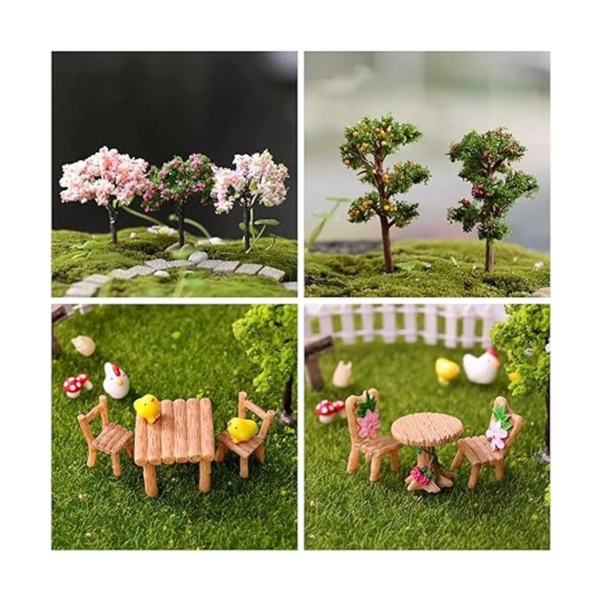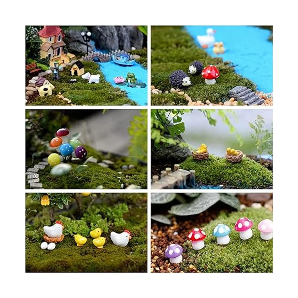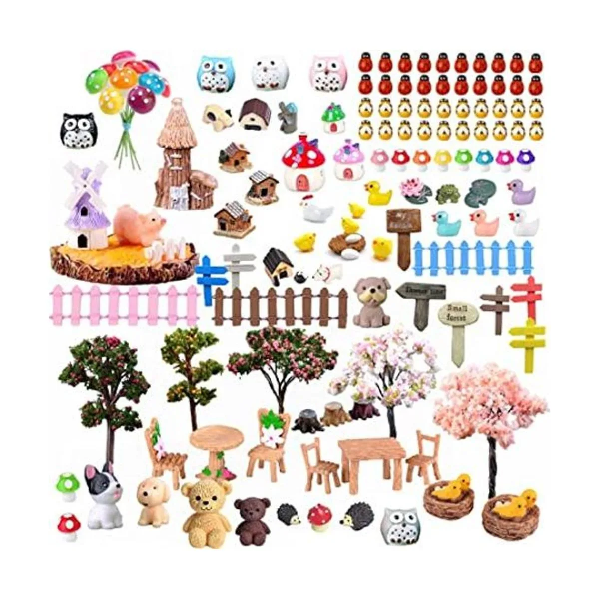 Kit de 132 adornos de micropaisaje de jardín de hadas, que incluye: árboles, mesas y sillas, perros, erizos, setas, casas, letreros de calle, vallas, patos, pollos, vacas, mariquitas, abejas, cerdos, molinos de viento, búhos y mucho más. y todos los adornos que se muestran en la imagen principal.