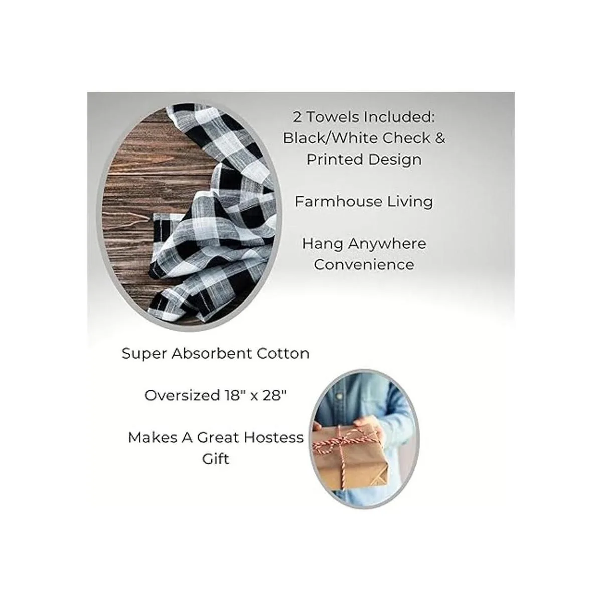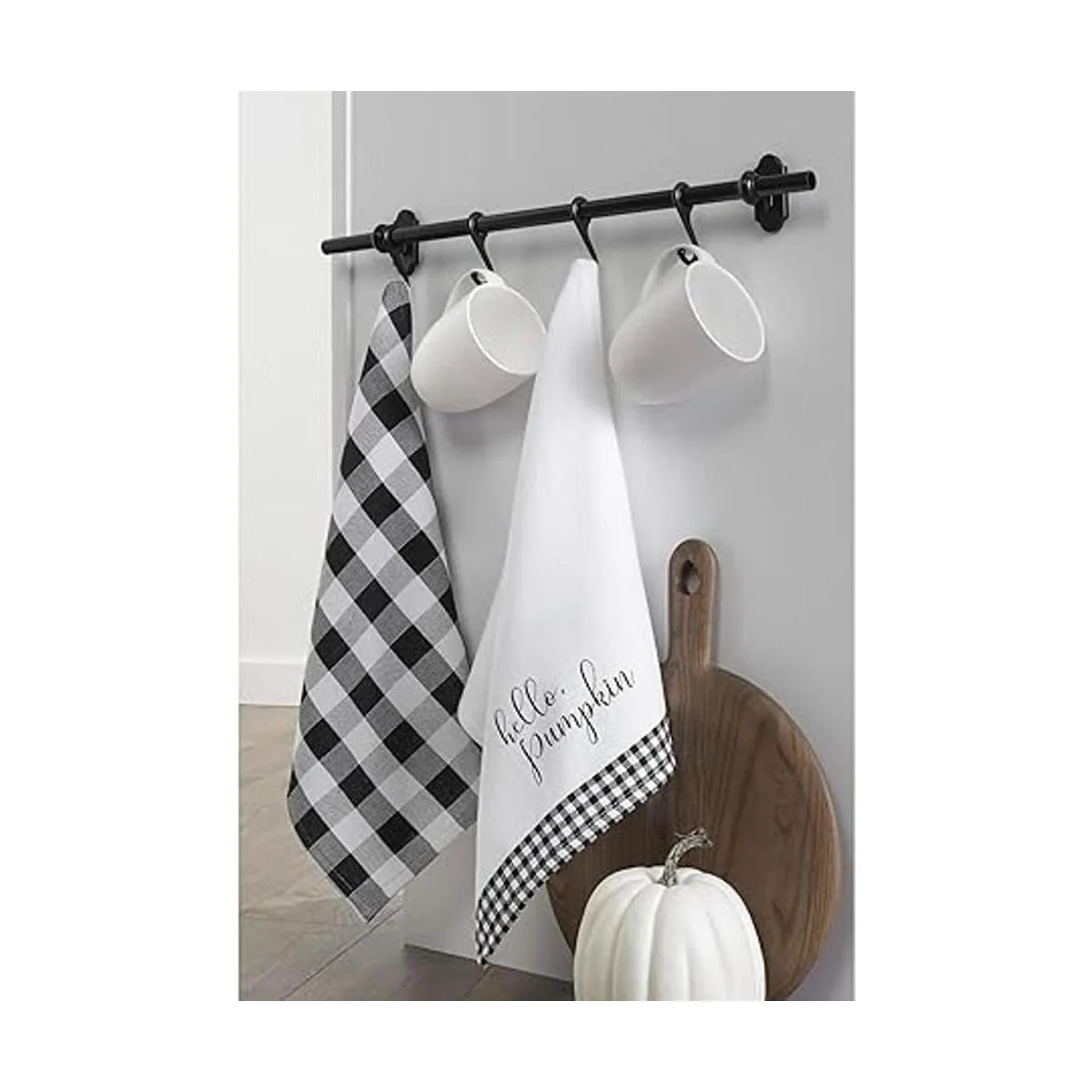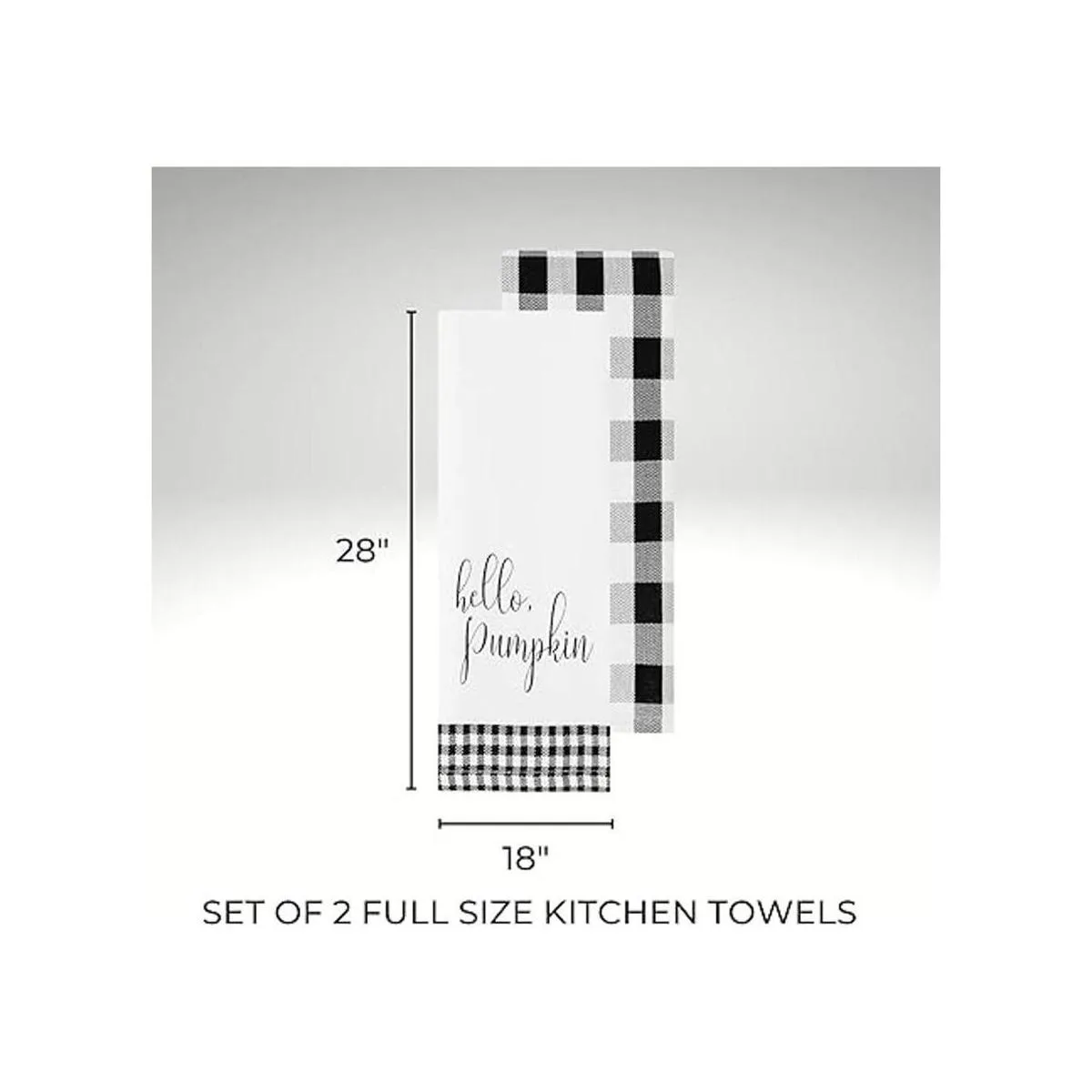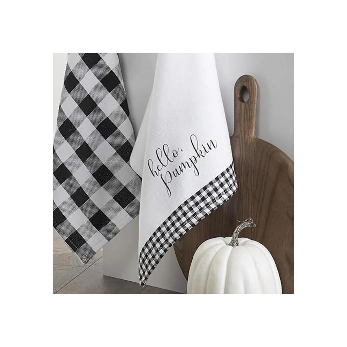 Cuenta con una toalla de cuadros de búfalo blanco y negro y una toalla a juego Hello Pumpkin.
