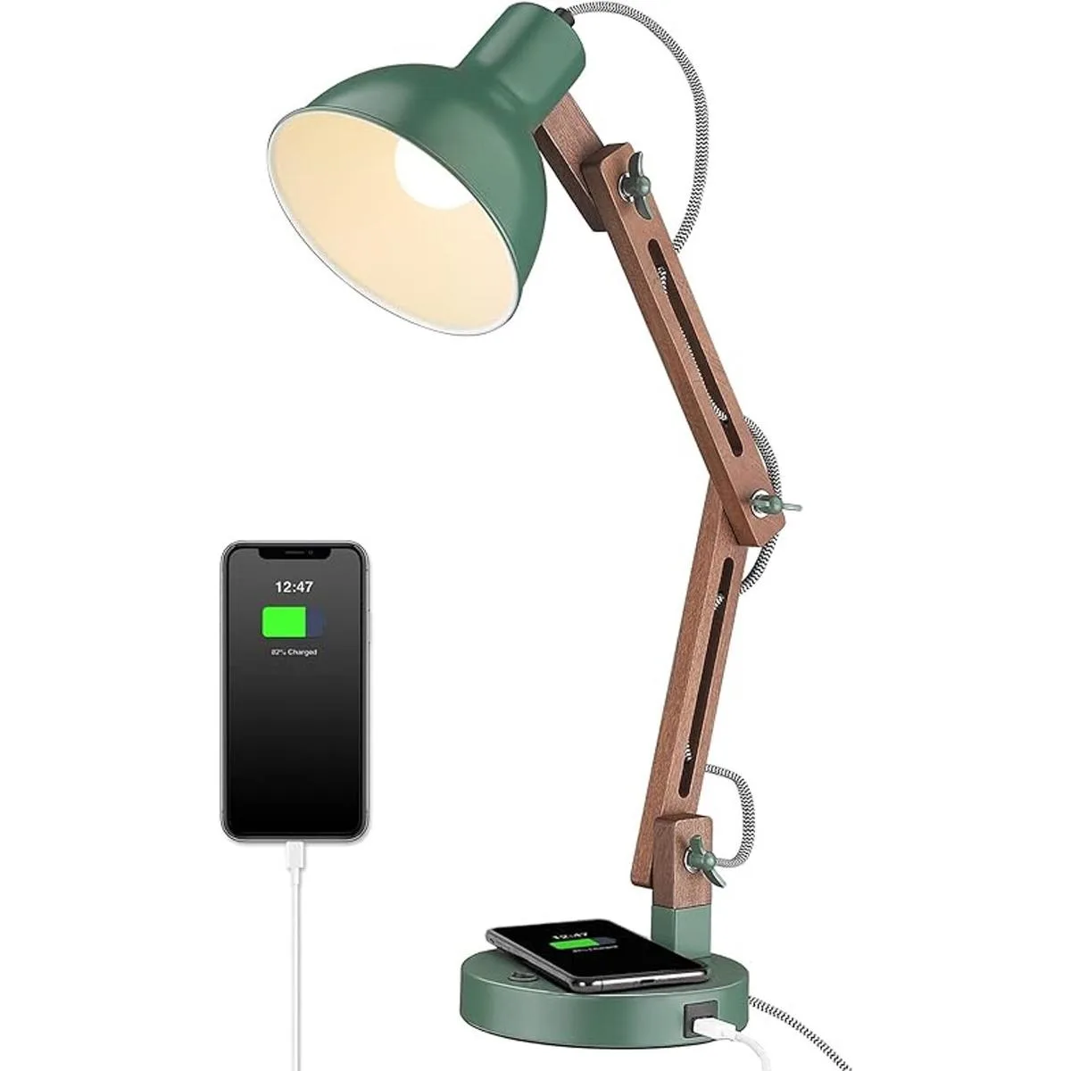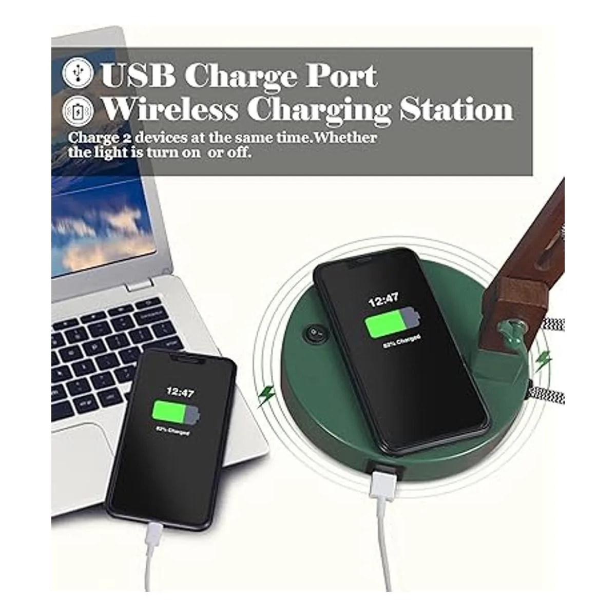 ELYONA Lámpara de escritorio LED mejorada, luz de lectura vintage con cargador inalámbrico, puerto USB, ajustable, lámpara de mesa de noche de madera con pantalla de metal verde para oficina en casa, dormitorio, sala de estar