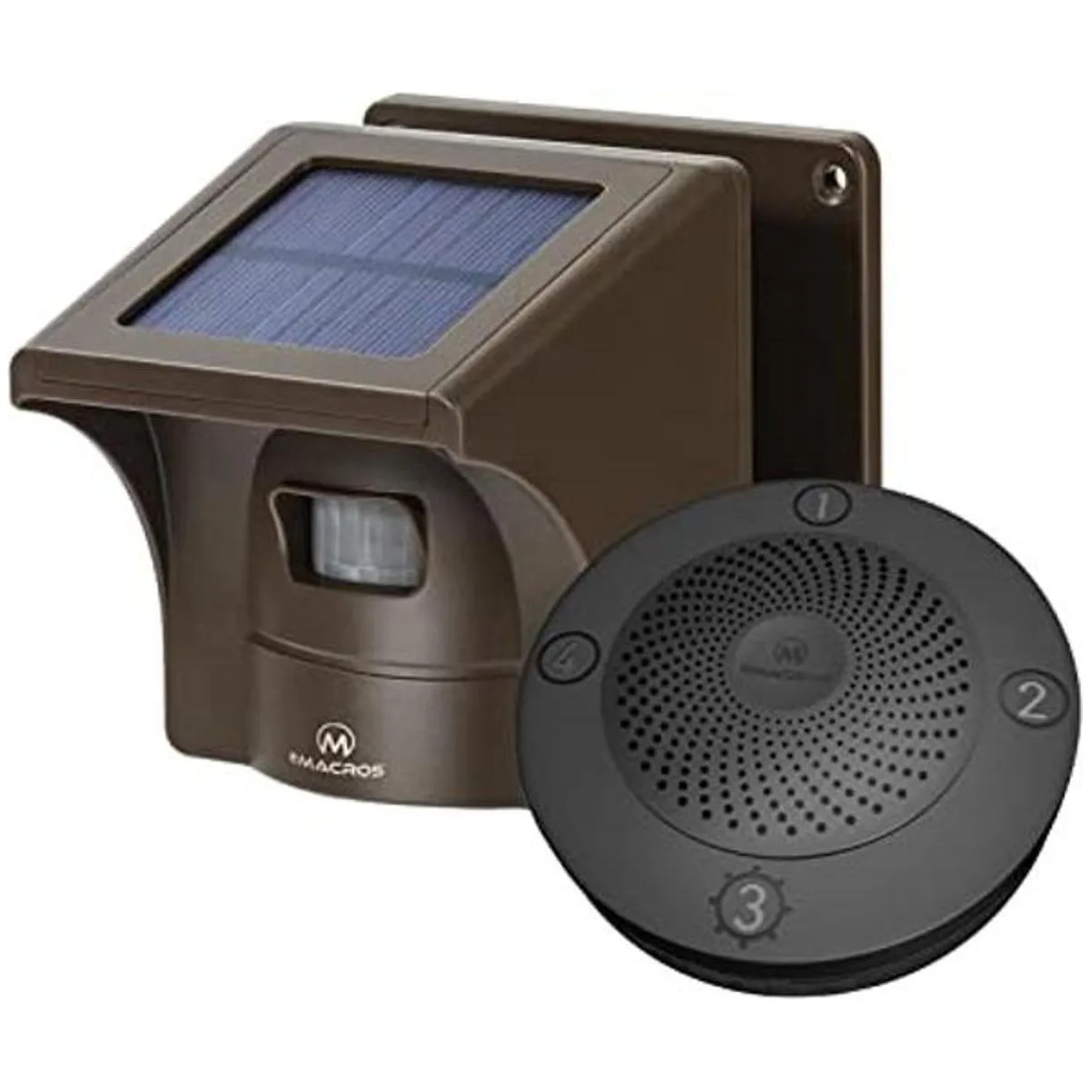 eMACROS Ventaja: sistema de alerta de entrada solar inalámbrico y solar producido en nuestra propia fábrica con nuestra tecnología de sistemas de vanguardia. Alarma solar inalámbrica para entrada incluye 1 receptor alimentado por CA y 1 sensor.