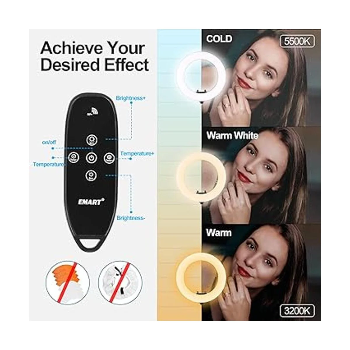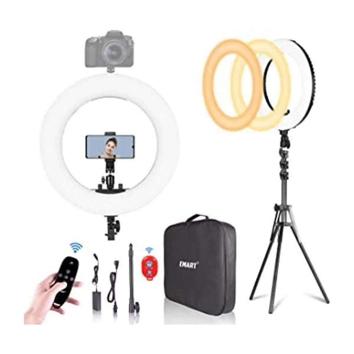 Emart Anillo de luz de 18.0 in con soporte, gran ajustable, 32005500 K, anillo de luces LED con área de iluminación ultra amplia para fotografía de cámara, videos de YouTube, maquillaje kit soporte para teléfono, control remoto, tubo suave, etc.