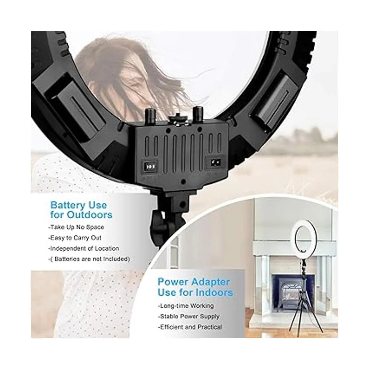 Anillo de luz de 18 pulgadas con soporte de luz: diseño especial LED SMD y 480 cuentas LED, perfecto para muchos usos, retratos, productos, mascotas y video. El trípode de luz de anillo y construcción de aleación de aluminio para estabilizar la luz del anillo de maquillaje, altura ajustable: mínimo de 33 pulgadas a máximo de 70 pulgadas.