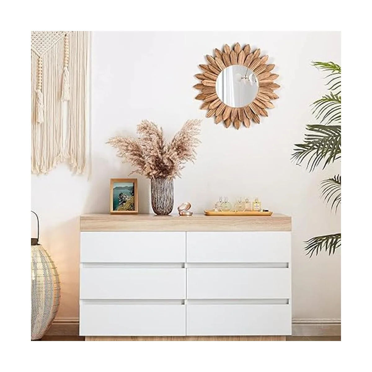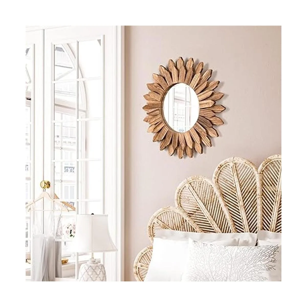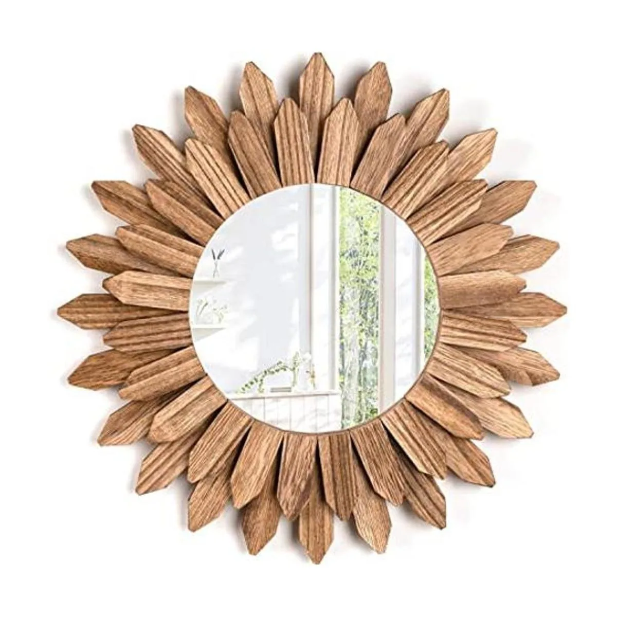 Espejo de decoración de pared bohemio: la decoración de pared del espejo consta de marco de madera con ráfaga solar y espejo redondo para hacer un espejo de estilo bohemio, se puede combinar con otros estilos de decoración, es una decoración estética perfecta para dormitorio, sala de estar, chimenea, pasillo, salón, entrada.