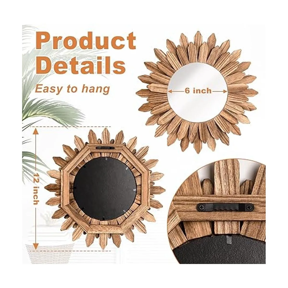 Decoración de espejo de pared pequeño: el diámetro total es de 12 pulgadas con marco de madera y 6 pulgadas de diámetro para el espejo solo; no necesita montaje, muy fácil de colgar en la pared; viene con anclaje y tornillo.