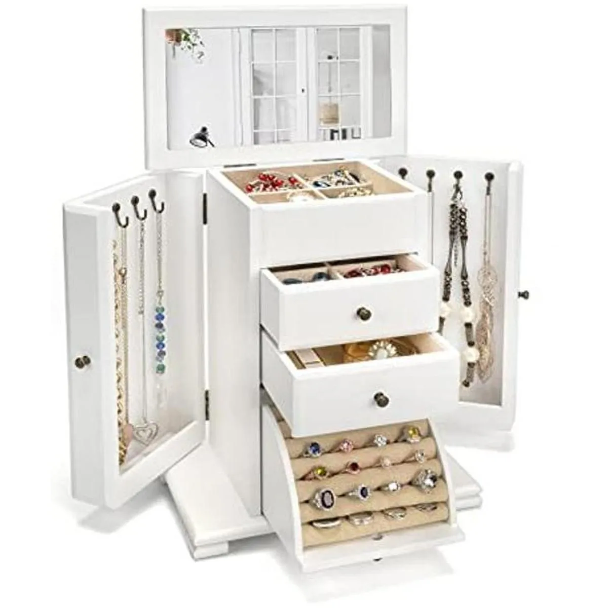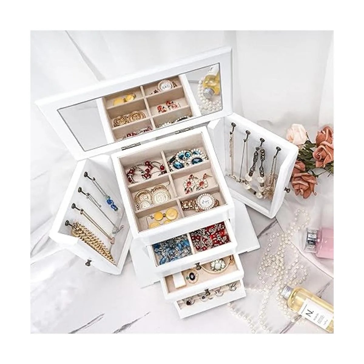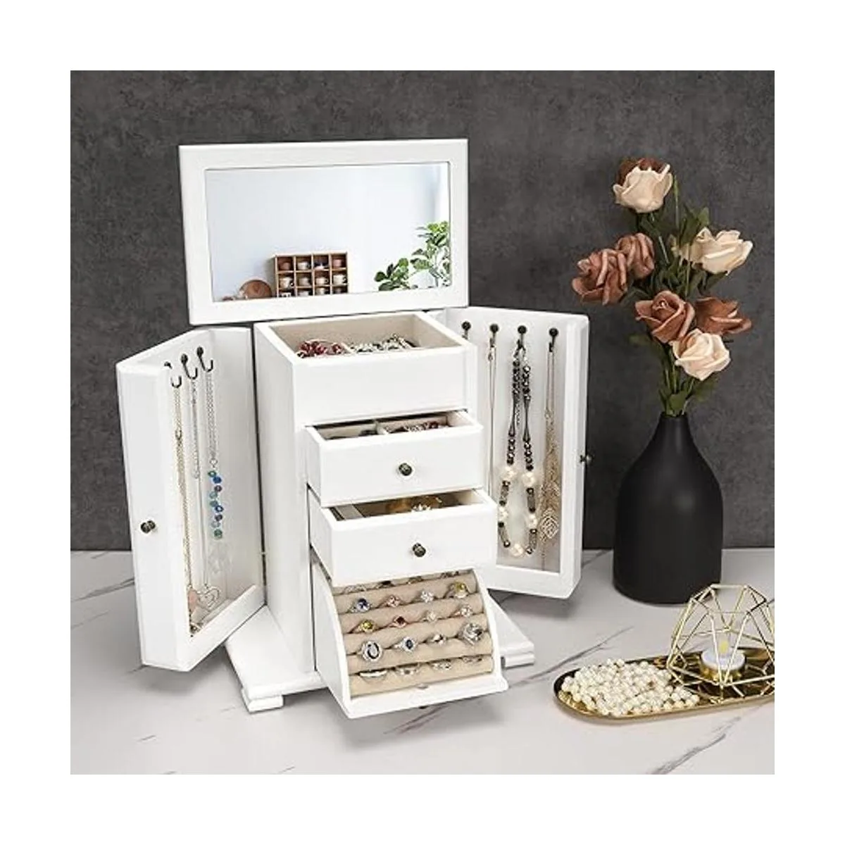 Emfogo Joyero para mujer, joyero de madera rústica y organizadores con espejo, caja organizadora de joyas de 4 capas para anillos, aretes, collares, pulseras blanco desgastado