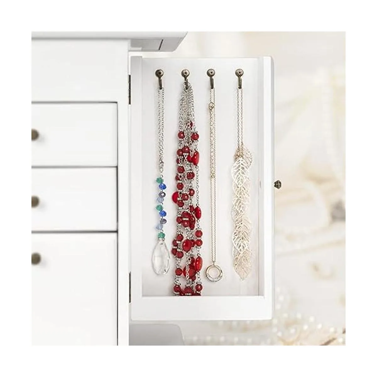 Colecciona toda la belleza: cada mujer tiene la experiencia de perder joyas, verdad Este gran joyero es atemporal con un acabado lacado blanco y puertas dobles, pero también tiene todo lo que necesitas para almacenar una colección de joyas moderna. 4 compartimentos diferentes para almacenar diferentes joyas, como aretes, brazaletes, anillos y otros accesorios. 2 puertas laterales de joyeros para colgar collares y pulseras.