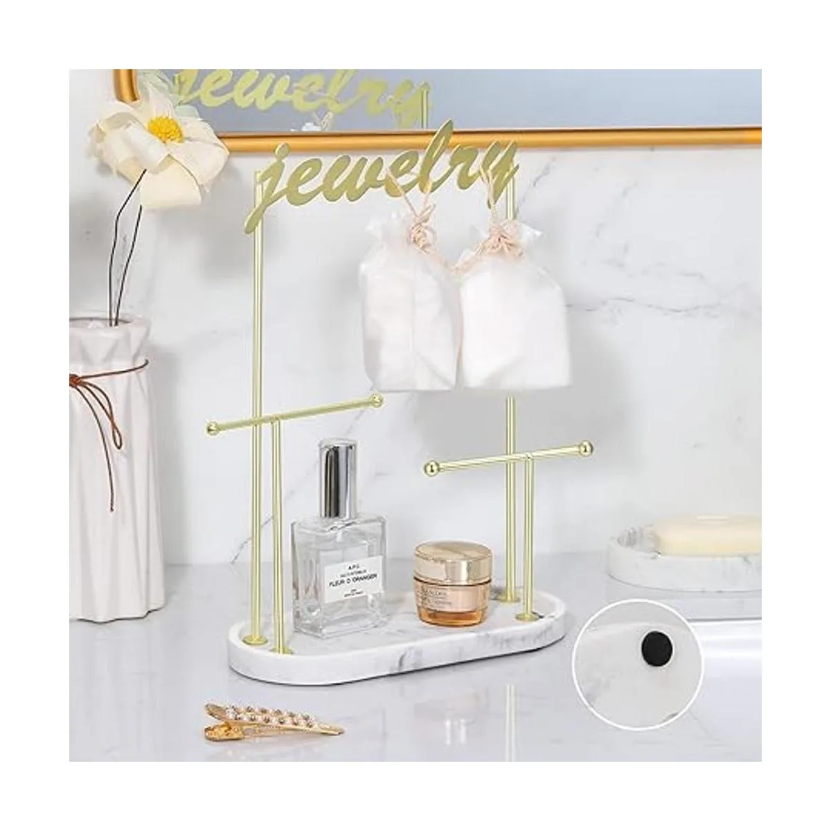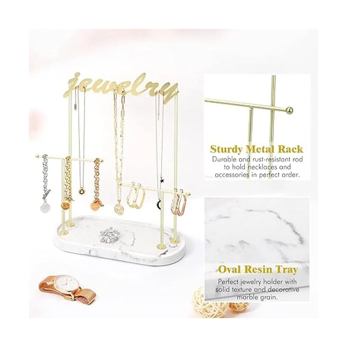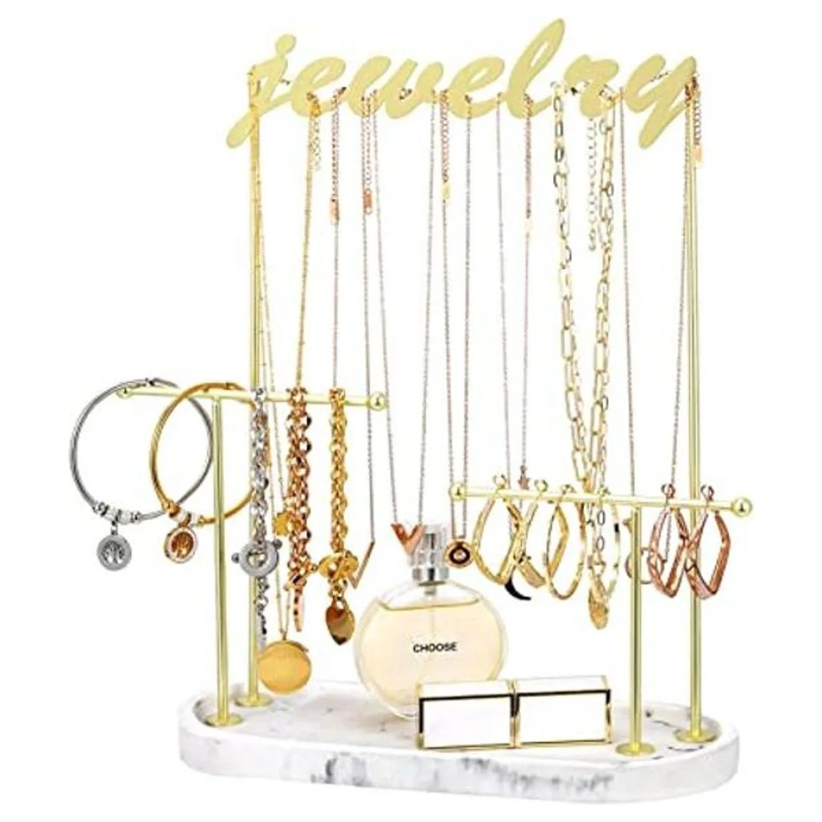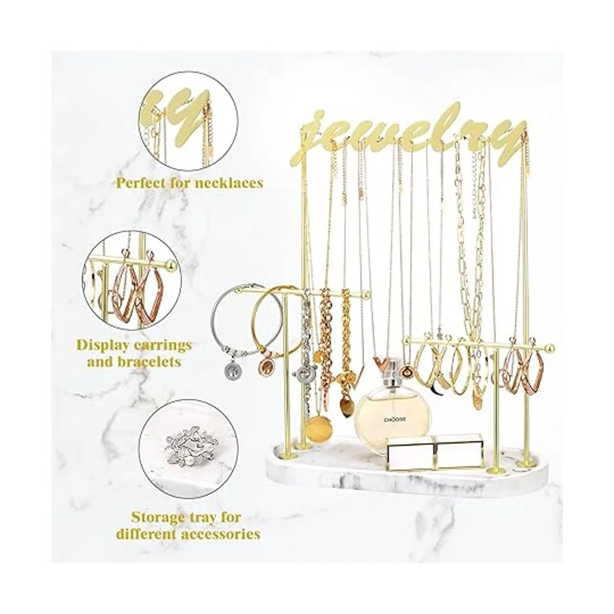 Emibele Soporte organizador de joyería, soporte para collar, soporte de joyería de 2 niveles con bandeja de anillo de resina, estante de metal dorado, collar colgante, pulsera, reloj, aretes, árbol de joyería, mármol blanco