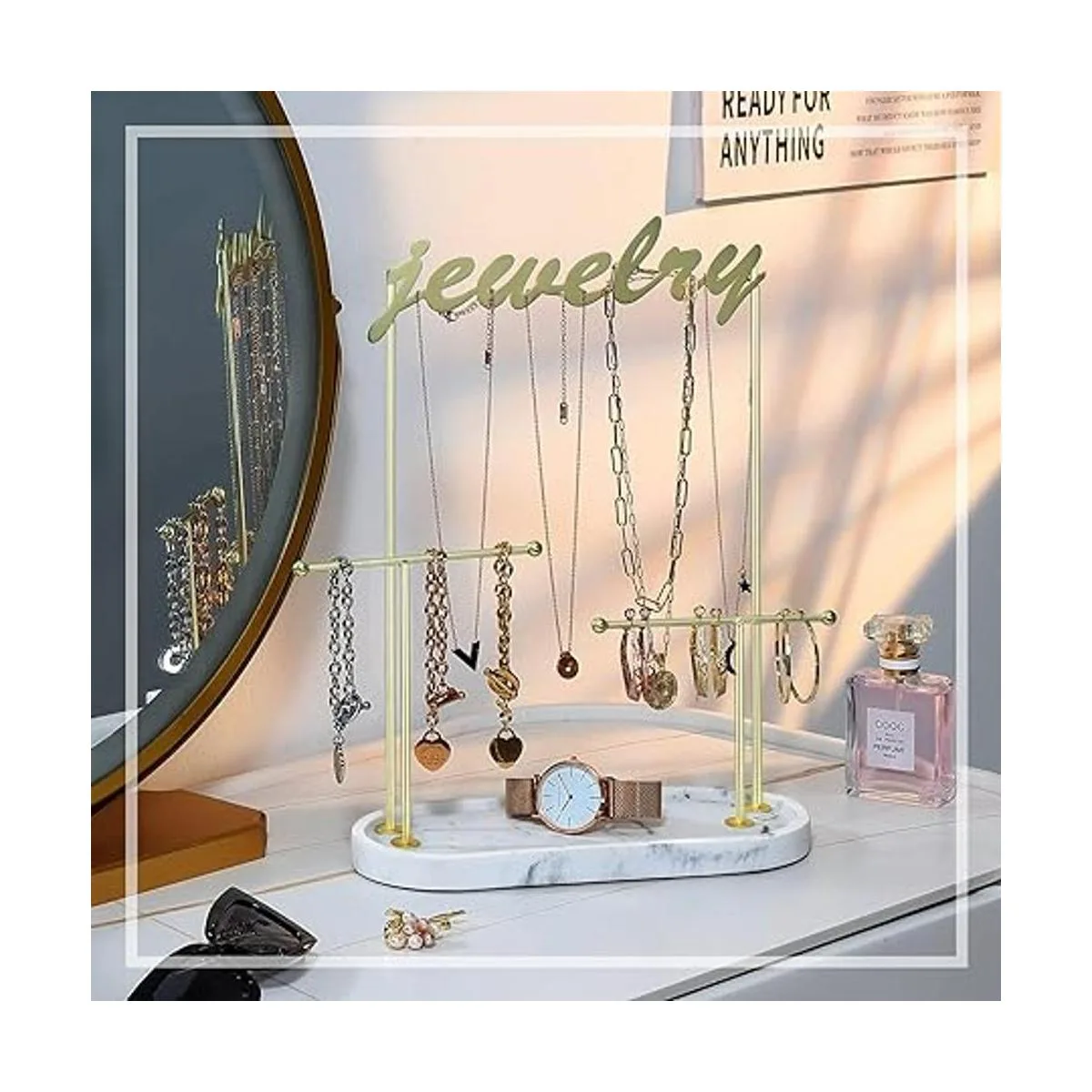 Soporte para collar sin enredos: este soporte de joyería de 2 niveles está diseñado para un acceso rápido a tus artículos. La barra superior es perfecta para colgar tus collares. La barra en T media puede contener bandas para el cabello, brazaletes, pulseras y relojes. La bandeja inferior de resina puede contener horquillas, anillos, pendientes, etc. Es mucho más fácil y rápido ver y elegir lo que quieras.