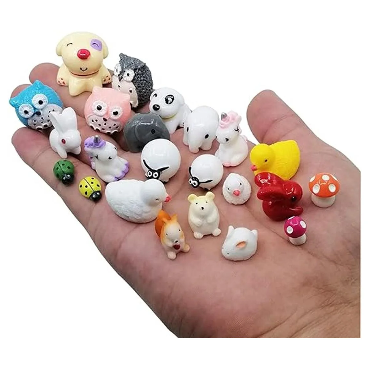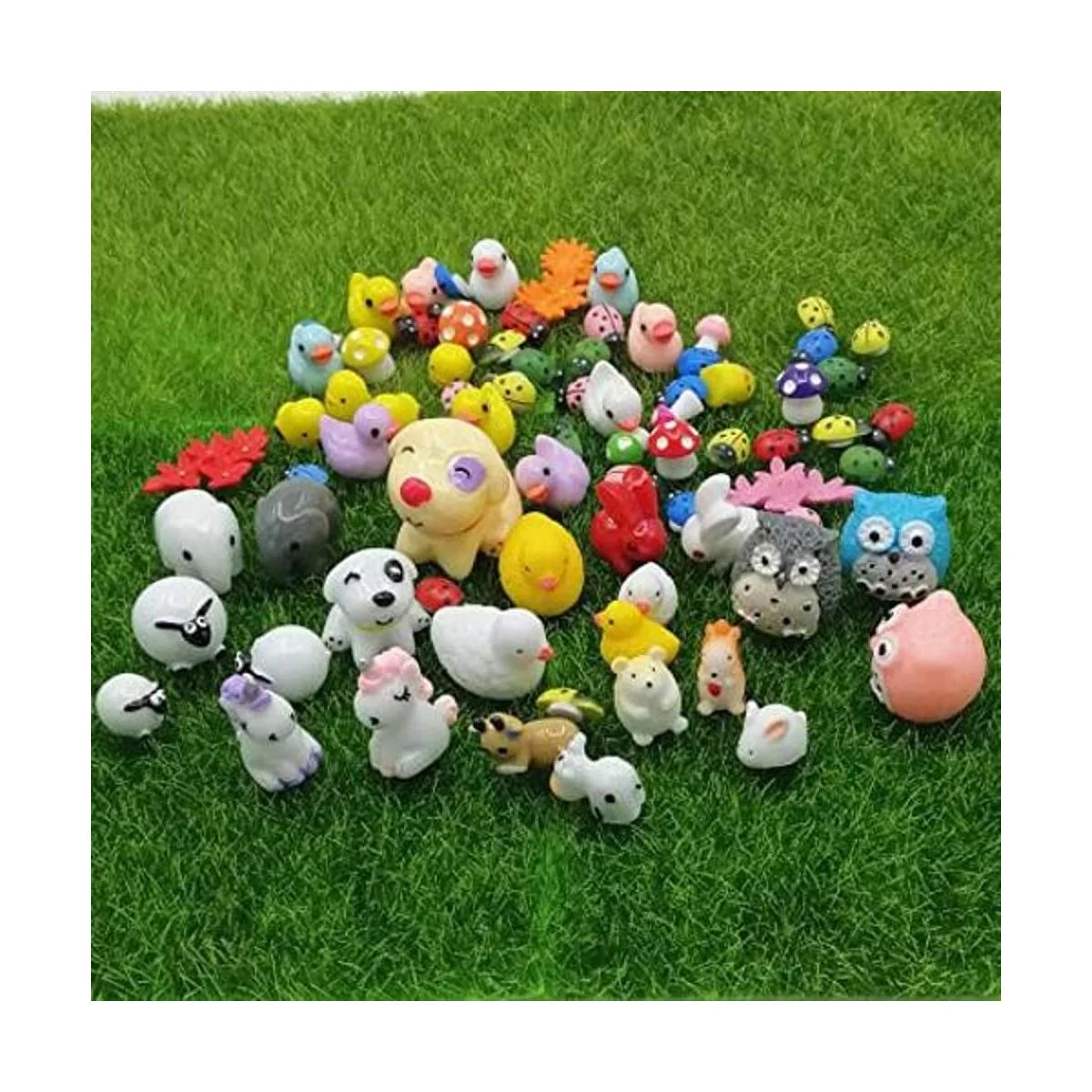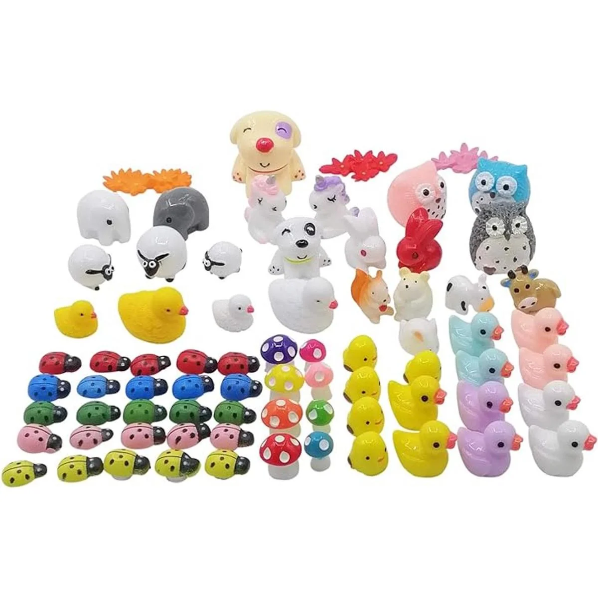 Varios animales bonitos: 4 patos, 4 setas pequeñas, 2 elefantes, 2 conejos, 2 vacas, 25 escarabajos femeninos, 5 pollos, 4 setas grandes, 2 perros, 10 patos, 3 ovejas, 1 hámster, 1 ardilla, 1 conejo, 3 conejo. 2 búhos de unicornio. 3 flores artificiales de 74 piezas en total. Tipos de animales lindos, la mejor opción para decorar el jardín, plantas y hacer un propio zoológico.