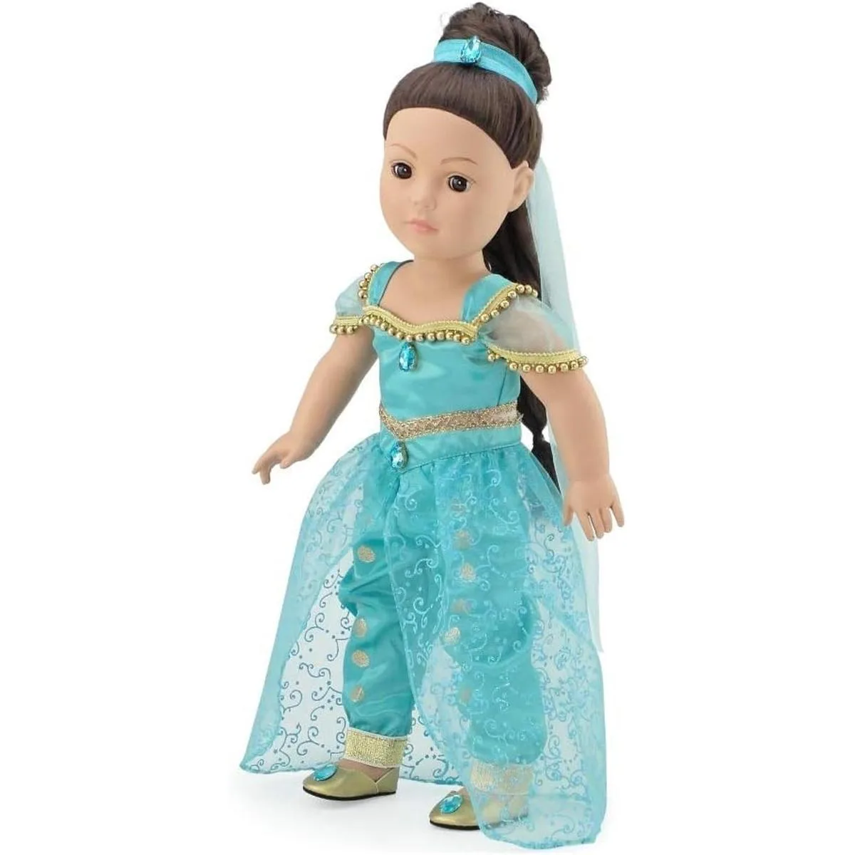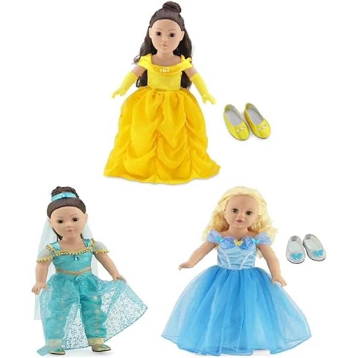 Hermoso paquete de 8 piezas de 18.0 in de princesa de muñeca, incluyendo vestido de baile de Cenicienta con zapatos brillantes, vestido de Belle con elegantes guantes a juego, y juego de jazmín de Aladin con una pieza única de zapatos y cabeza.