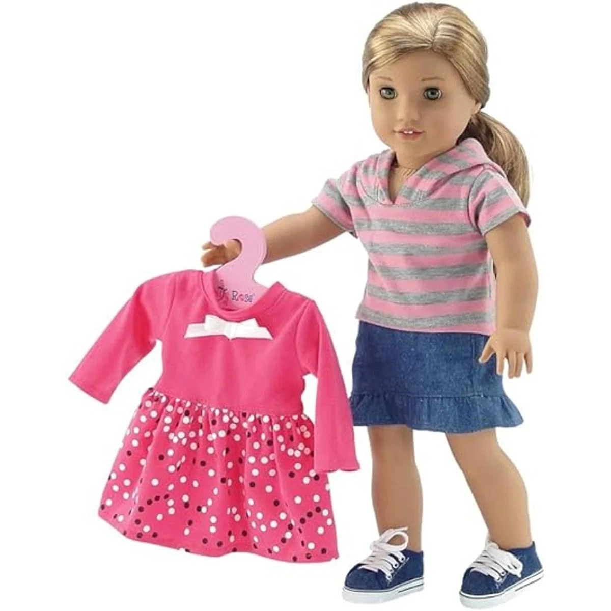 El armario de almacenamiento para muñecas viene con 5 perchas rosas del tamaño perfecto.