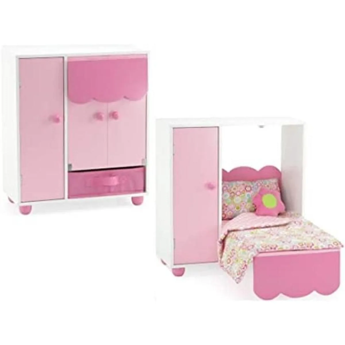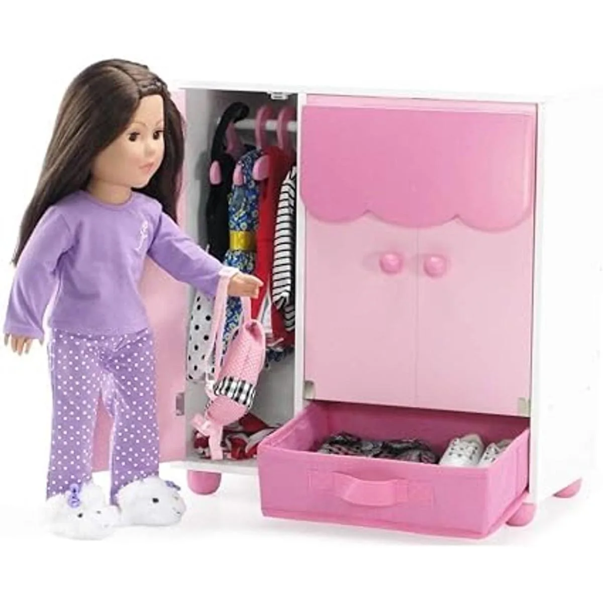 Emily Rose Muebles de muñeca de 18 pulgadas, cama de muñeca Murphy todo en uno que ahorra espacio con armario de muñecas y contenedor de almacenamiento de ropa de muñecas, compatible con niñas estadounidenses de 18 pulgadas y muñecas similares
