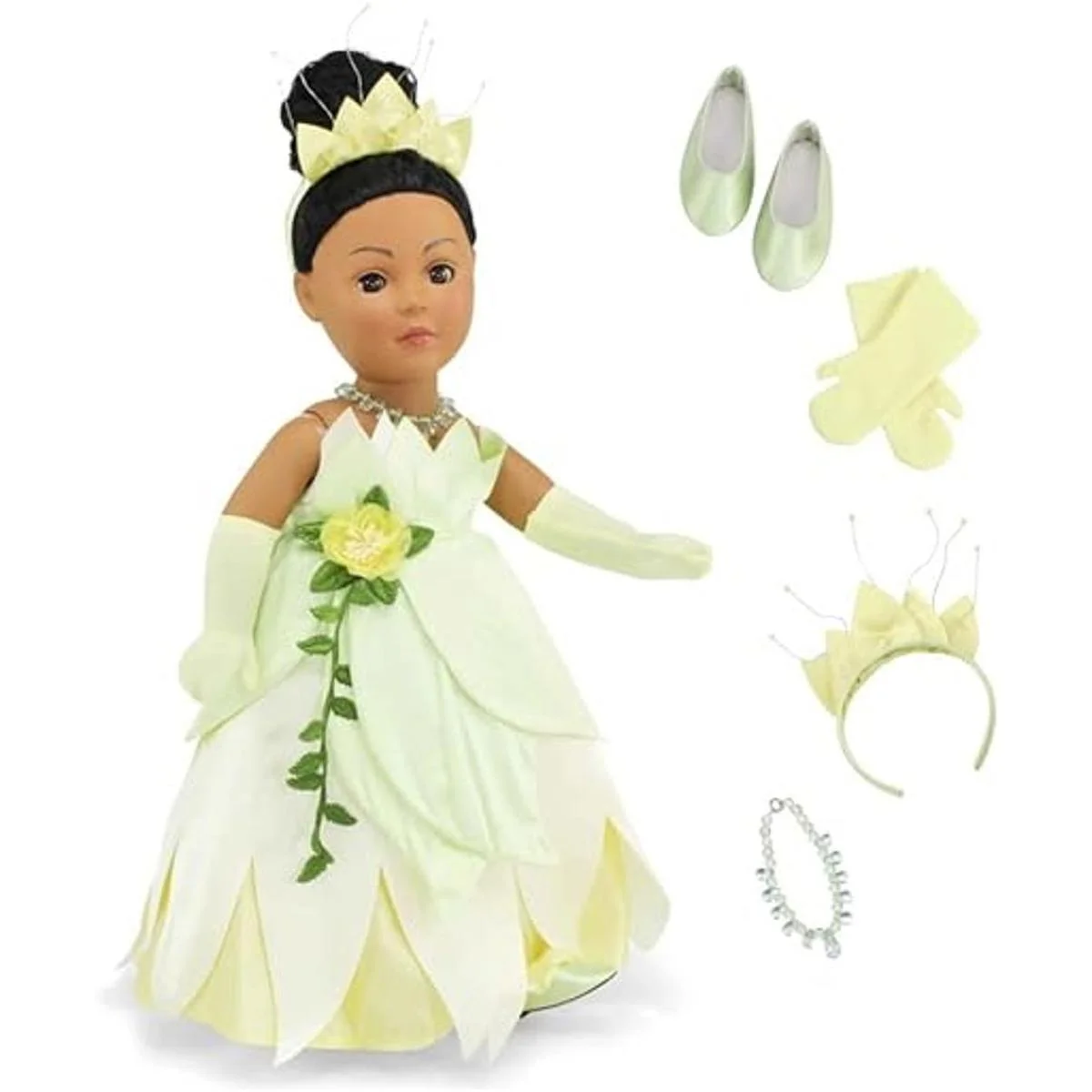 Emily Rose Muñeca de 18 pulgadas, 5 piezas, inspirada en la princesa Tiana, juego de disfraz de Halloween de 18 pulgadas con corona, collar, guantes y zapatos a juego, compatible con niña estadounidense de 18 pulgadas y muñecas similares