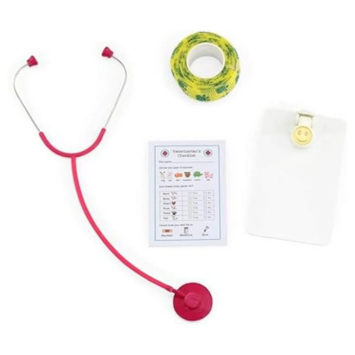 El juego también incluye un estetoscopio rosa, almohadilla de lista de verificación de salud animal, portapapeles y envoltura de vendaje colorida.