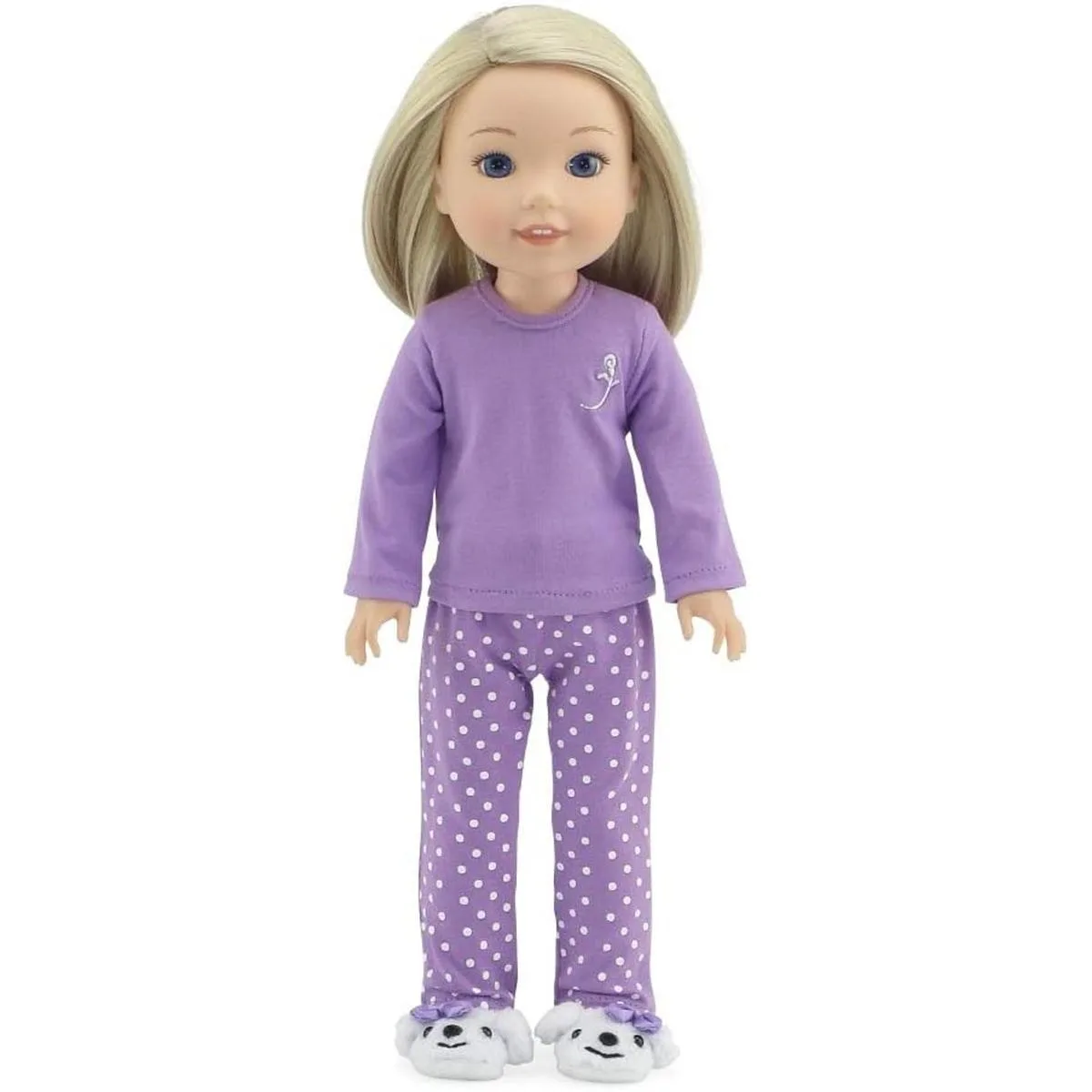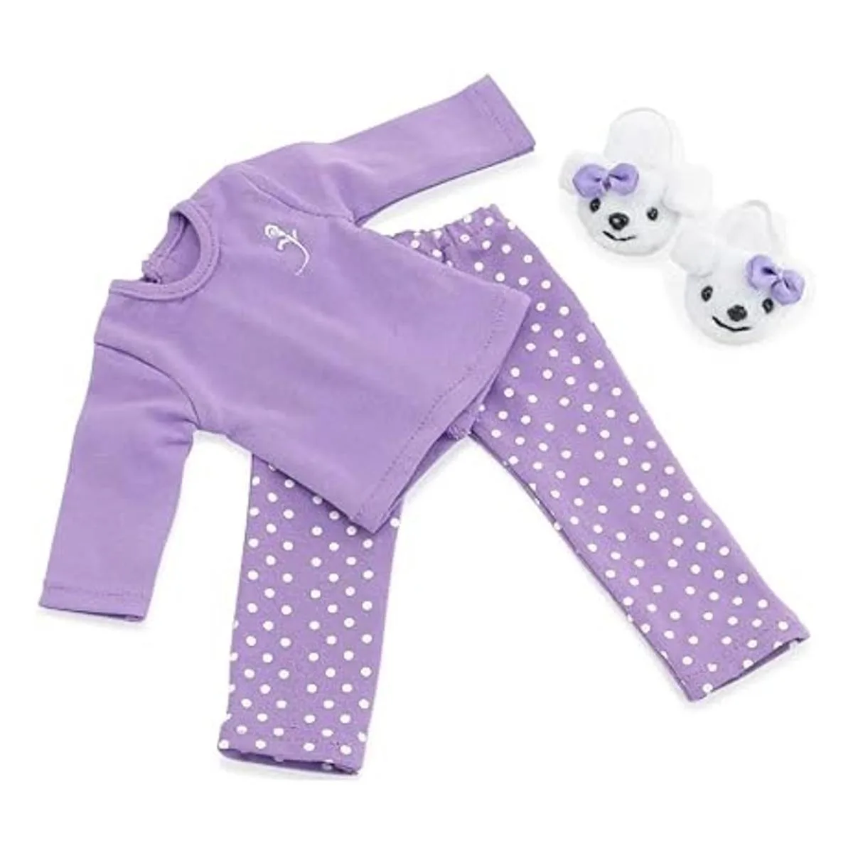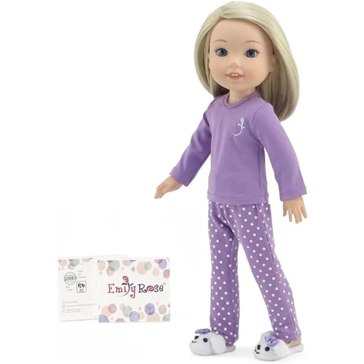 Tu muñeca de 14 pulgadas estará cómoda y lista para la cama con estos suaves pijamas de lunares morados, incluyendo pantalones de cintura elástica para vestir fácilmente y camiseta de manga larga a juego con el logotipo de Emily Rose.
