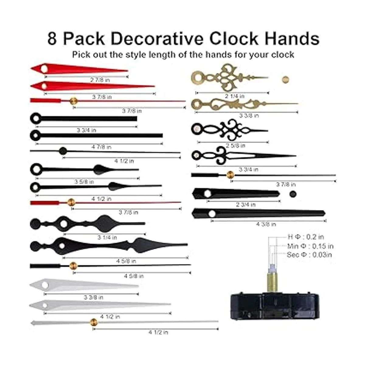 Paquete de 8 manecillas de reloj: incluye manecillas de reloj clásicas modernas y retro, aptas para esfera de reloj de 12 a 11.8 in de diámetro; puedes elegir el estilo y la longitud de las manecillas que se ven mejor para reemplazar relojes o bricolaje sin cargo adicional