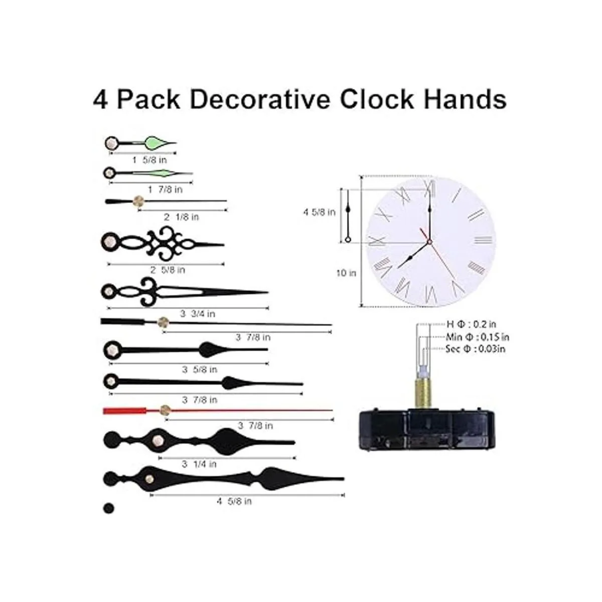 Manecillas decorativas: 4 unidades de manecillas para reloj para diferentes opciones, se ajustan a la esfera del reloj de 5 a 12 pulgadas de diámetro; puedes elegir el estilo y la longitud de las manecillas que se ven mejor con tu reloj sin cargo adicional