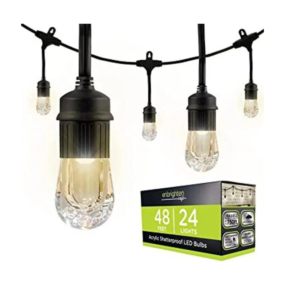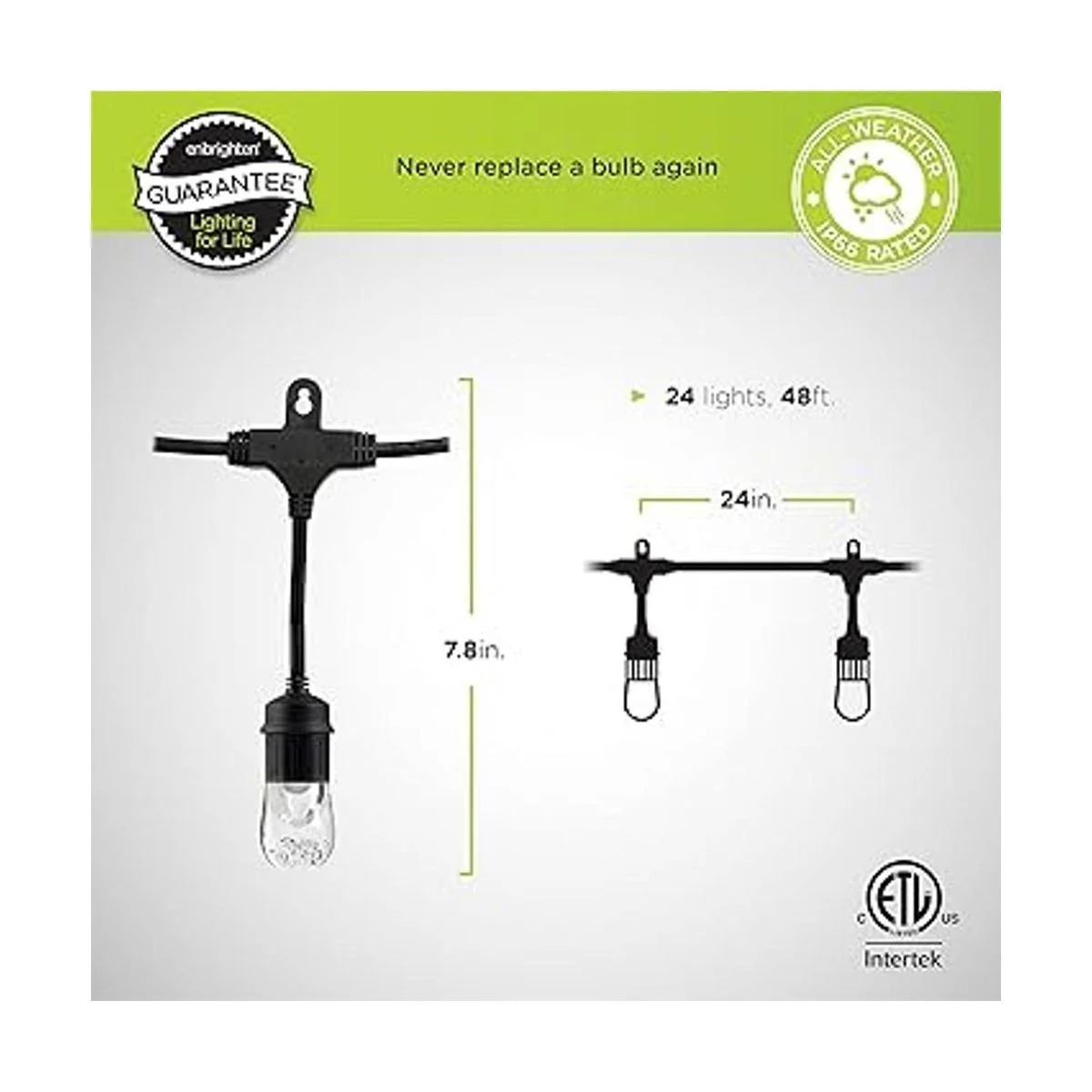 Enbrighten 31660 Cadena de luces LED clásicas para cafetería, color negro, 12 pies de longitud, 6 bombillas resistentes a los impactos, inastillables, resistentes a la intemperie, para interiorexterior, grado comercial, con certificación UL, 31664999, 12.00watts, 120 volts