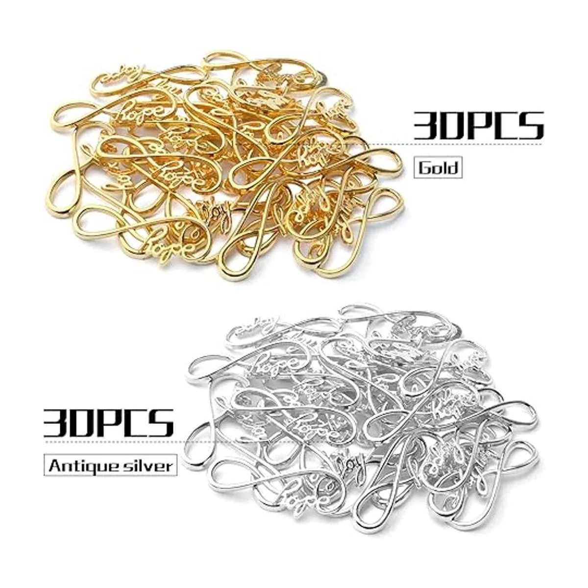El paquete incluye: recibirás 60 abalorios de infinito en 2 colores oro y plata antigua, 30 unidades de cada color; el tamaño es de 1.535 in de largo, 0.524 in de ancho, 0.087 in de grosor.