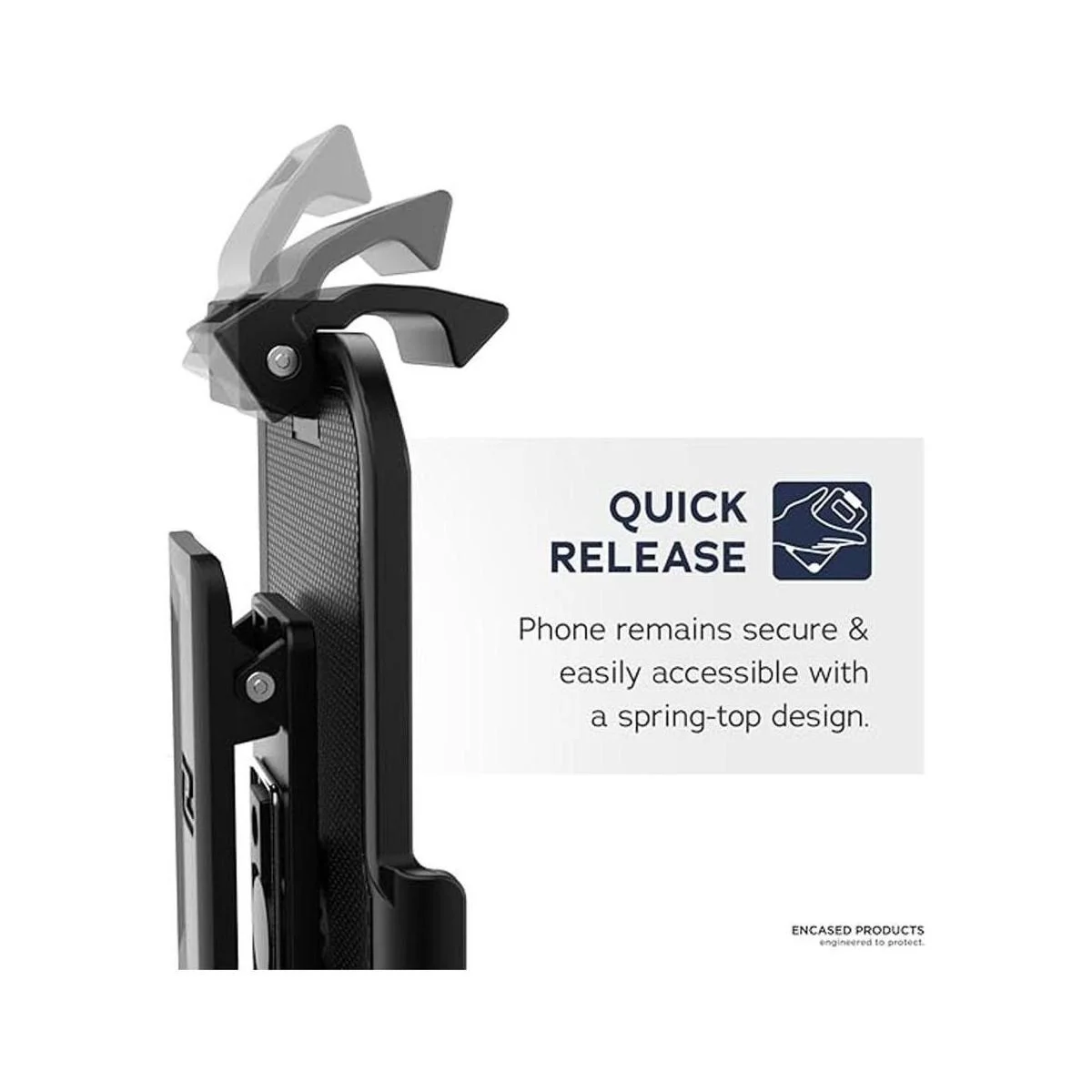 El Encased Clipmate está diseñado para funcionar perfectamente con tu funda, manteniendo tu teléfono al alcance de la mano.