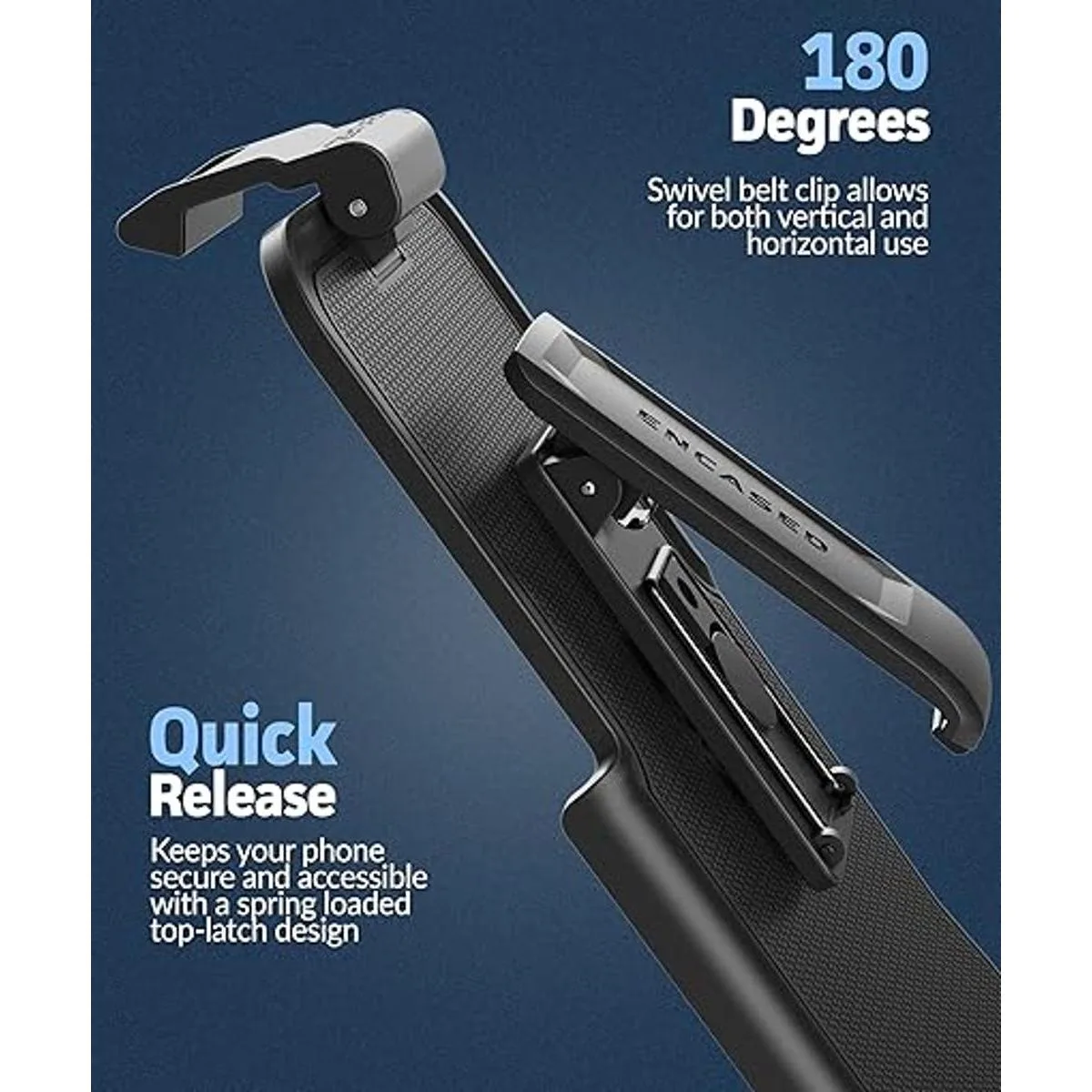 La funda de clip para cinturón incluida está diseñada con un marco de policarbonato de núcleo sólido y un clip giratorio reforzado que proporciona rotación de 180 con 5 subincrementos para uso vertical y horizontal.