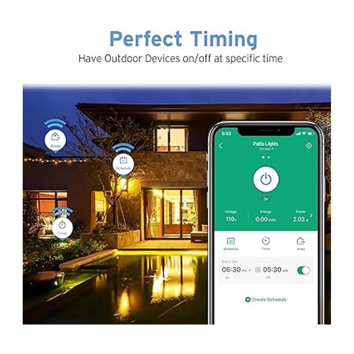 Diseño de doble salida: disfruta de un control personalizable sobre cada enchufe individual a través de la aplicación VeSync. Su potencia nominal de 15 A/1800 W significa que 2 aparatos se pueden utilizar a la vez, ideal para luces de cadena de vacaciones, fuentes, bombas de piscina y mucho más