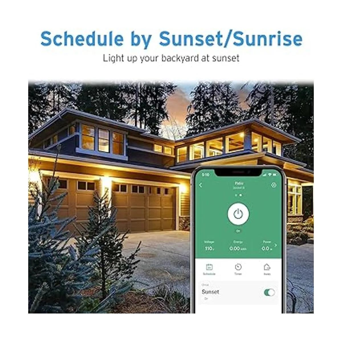 Opciones de atardecer y amanecer: coordina los horarios individuales de enchufes con los horarios locales de atardecer y amanecer. Programa luces navideñas para encenderlas al atardecer o decoraciones de patio para apagar al amanecer, especialmente conveniente durante las vacaciones