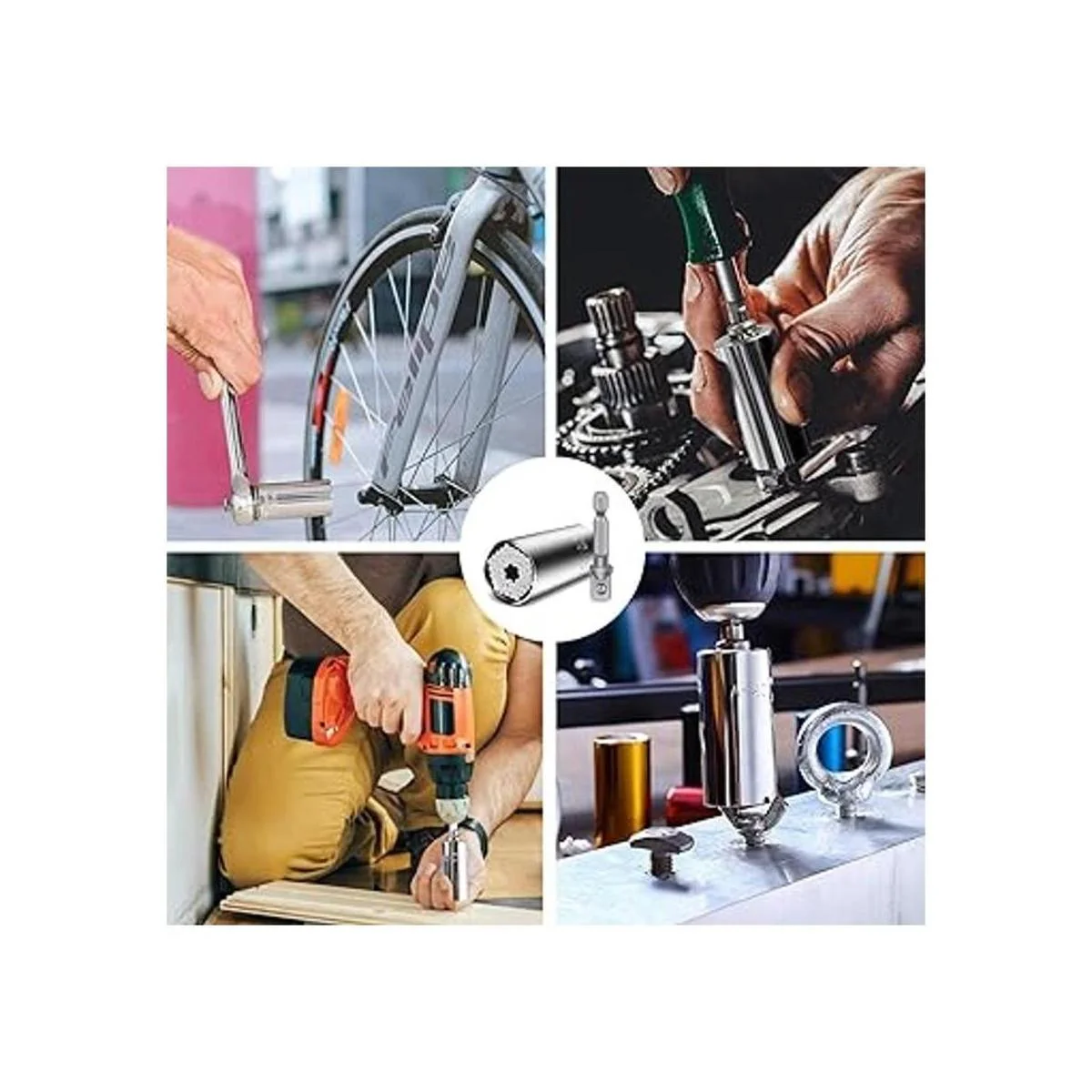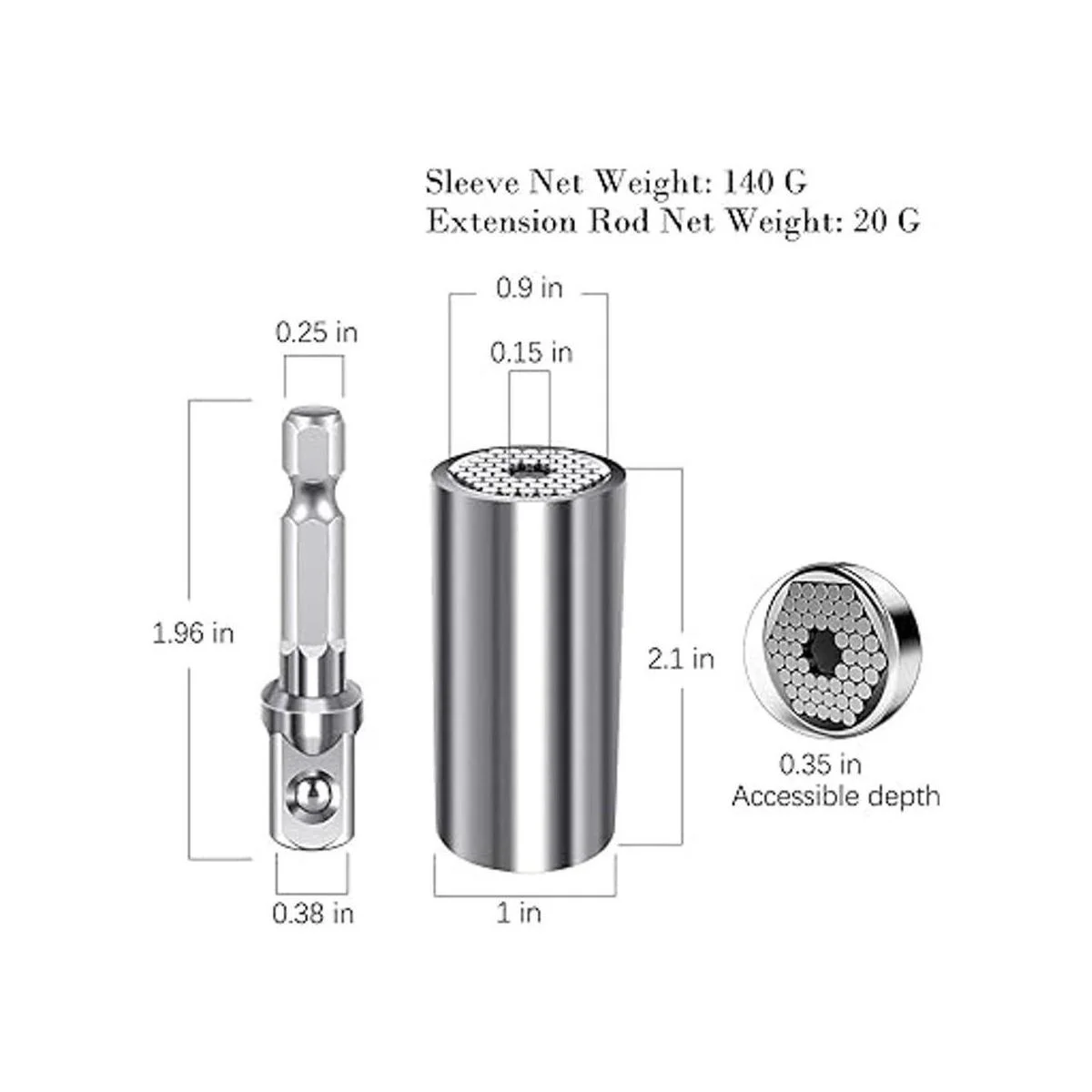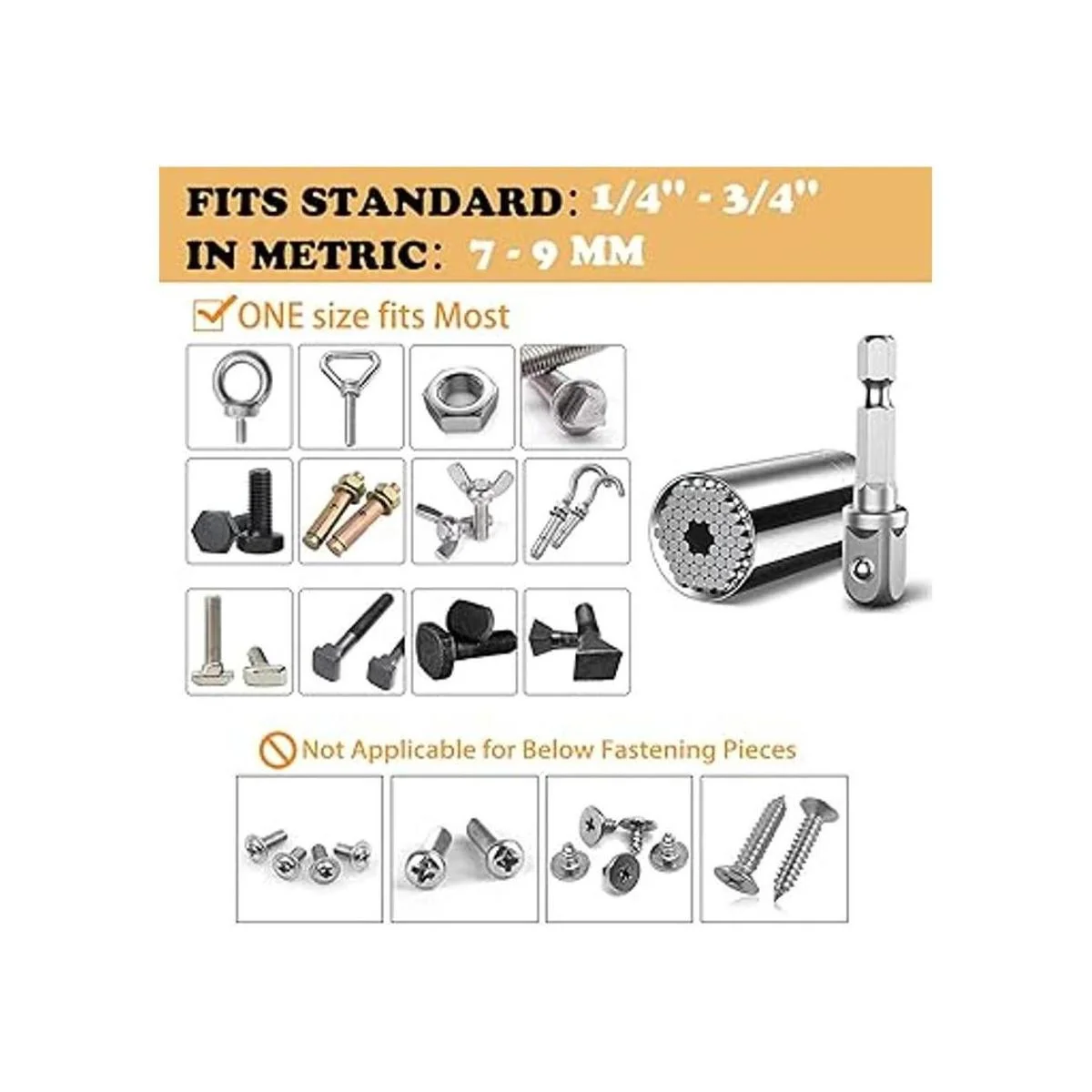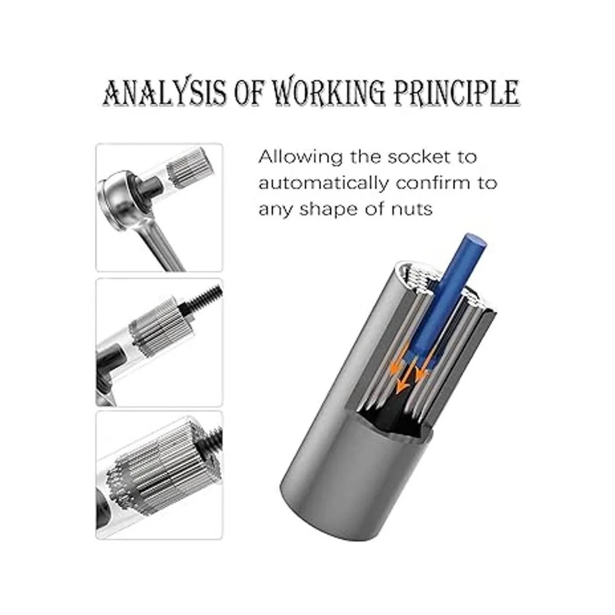 Super Socket: el enchufe universal se adapta tanto a tuercas y pernos estándar de 1/4 a 3/4 como métricos de 7 a 0.748 in. La llave de enchufe universal se ajusta al instante para agarrar tuercas hexagonales, ganchos, tornillos de ojo y retraso, cabezales de perno y otros objetos de varias formas y tamaños.
