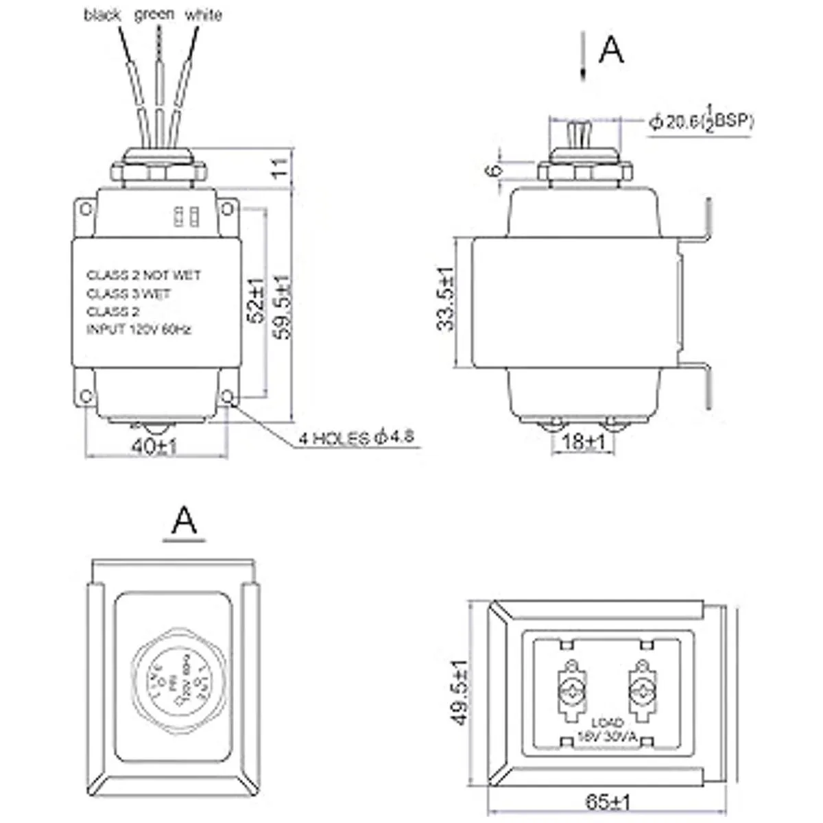 Especificaciones del producto: transformador de timbre de puerta de 16 V 30 VA: transformador de timbre de puerta cableado de bajo voltaje, entrada principal: 120 V CA 60 Hz, salida secundaria: 16 V CA 30 VA, aislamiento clase B, transformador de clase 2