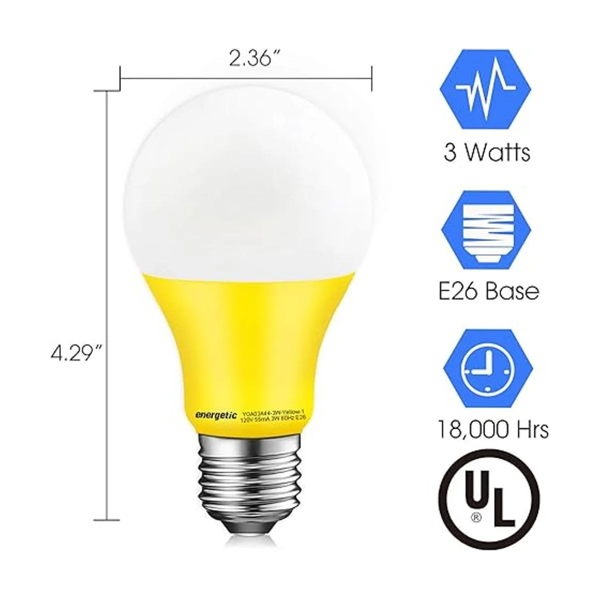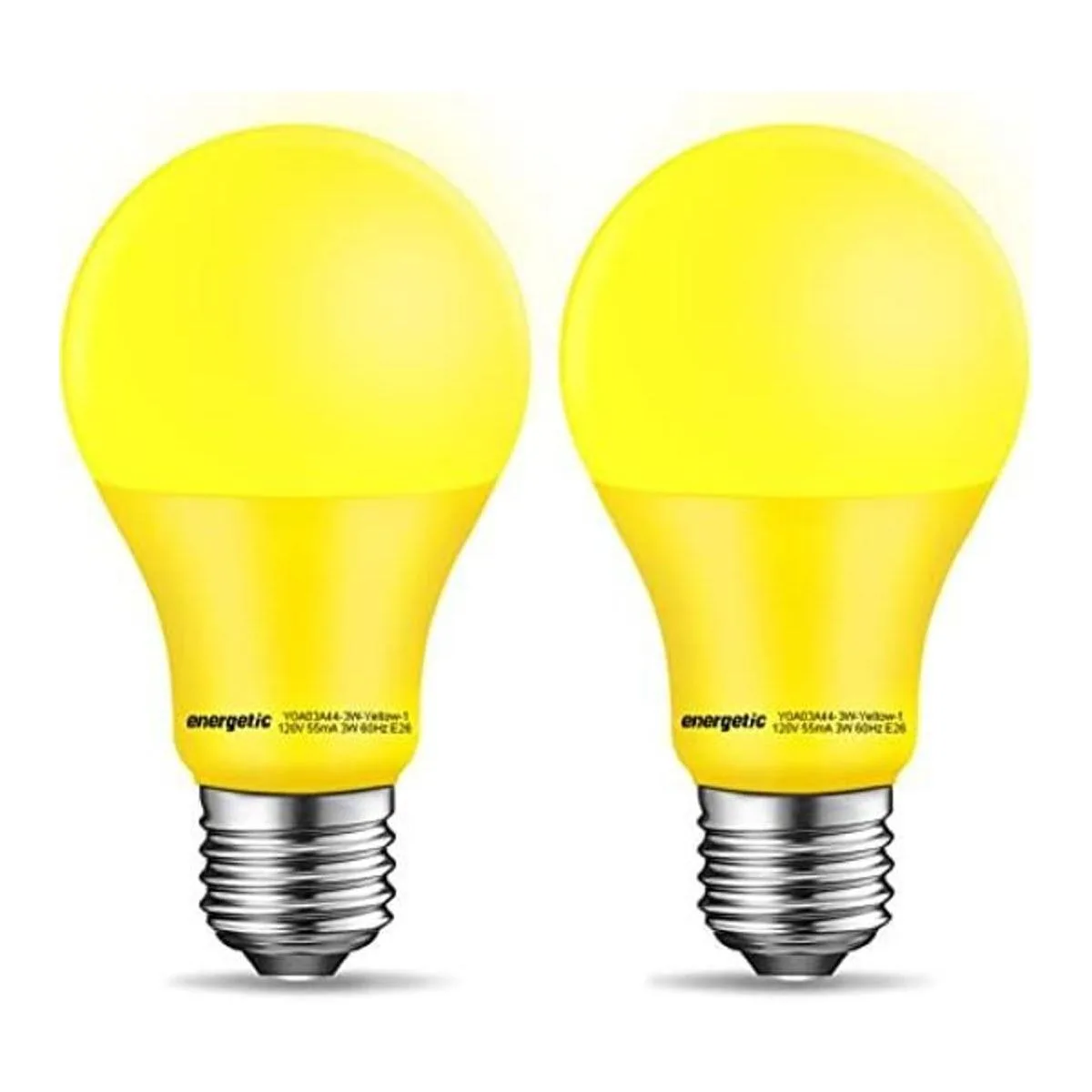 Energetic Bombilla amarilla A19, equivalente a 3 W, 40 W, base E26, bombilla LED no regulable para uso en interiores, decoración de fiestas, iluminación del hogar y vacaciones, certificación UL, paquete de 2