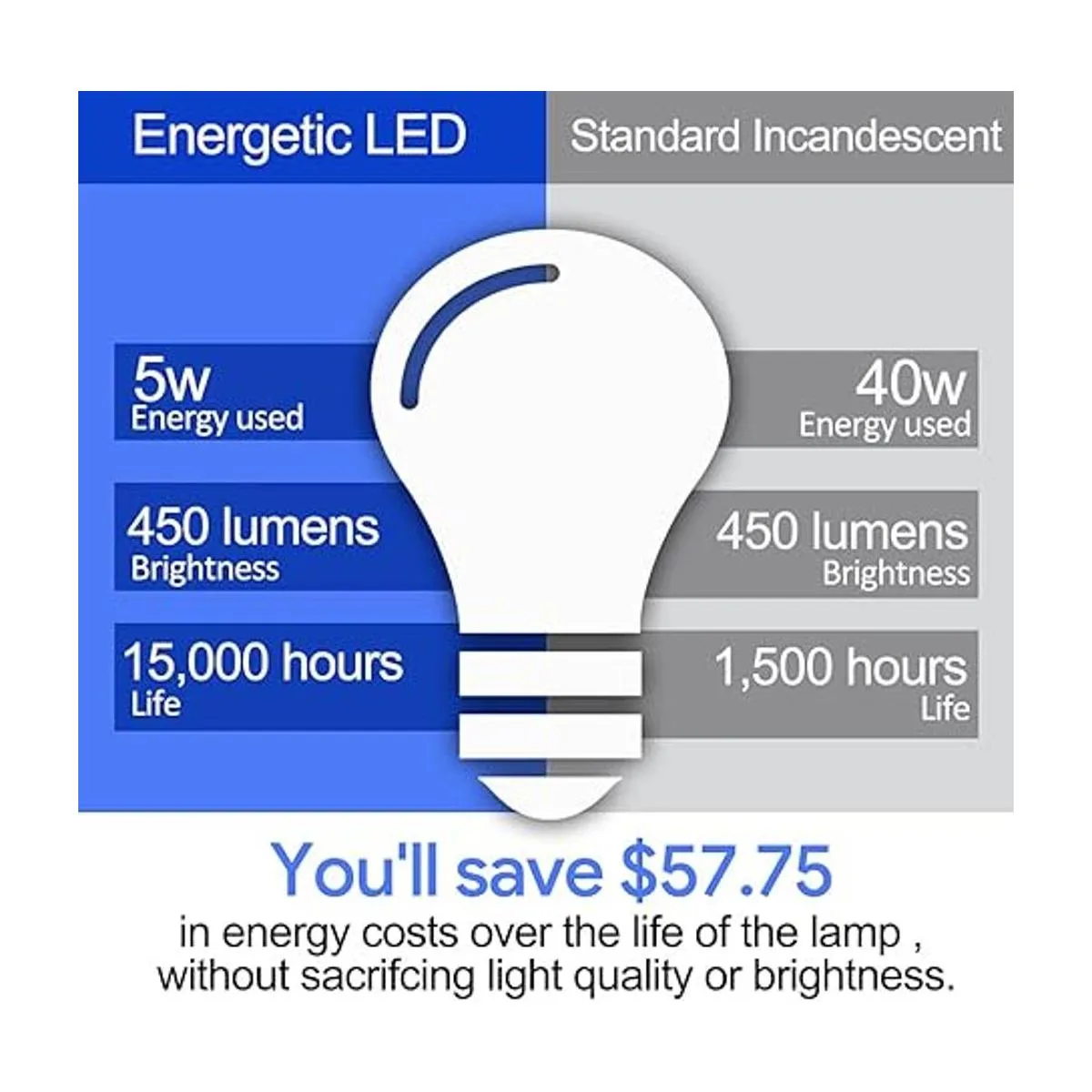 Energetic Bombilla LED A19, equivalente a 40 W, luz diurna de 5000 K blanco natural, base estándar E26, no regulable, 450 lm, certificación UL, paquete de 4