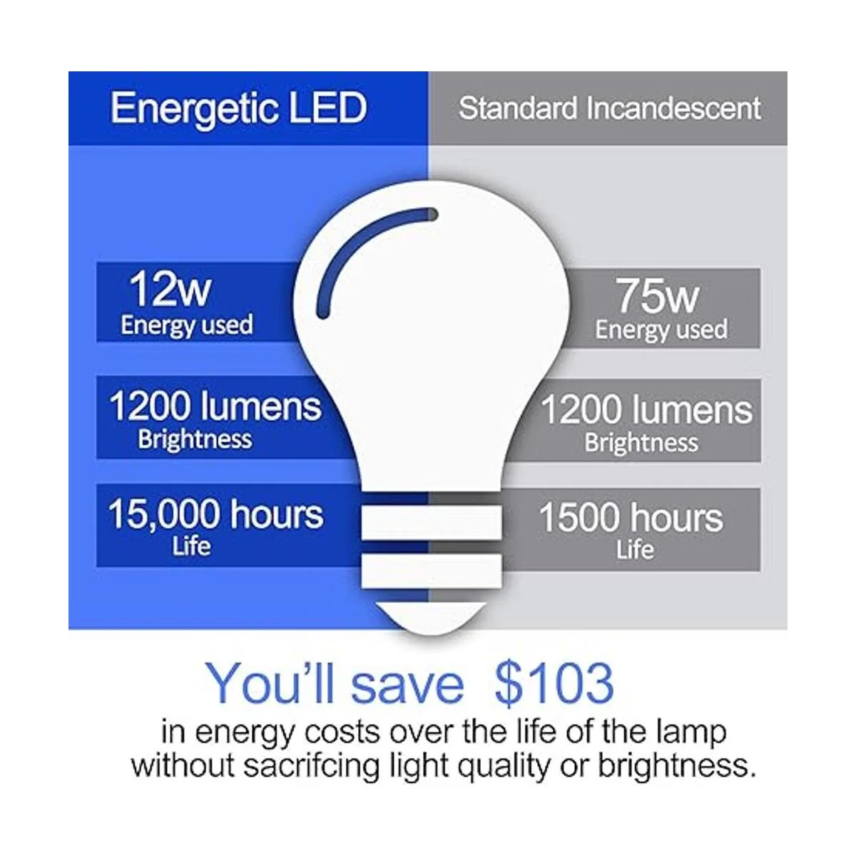 Energetic Bombilla LED A19 equivalente a 75 W, color blanco cálido de 3000 K, 1200 lúmenes, certificación UL, base estándar E26, bombilla LED no regulable, paquete de 4