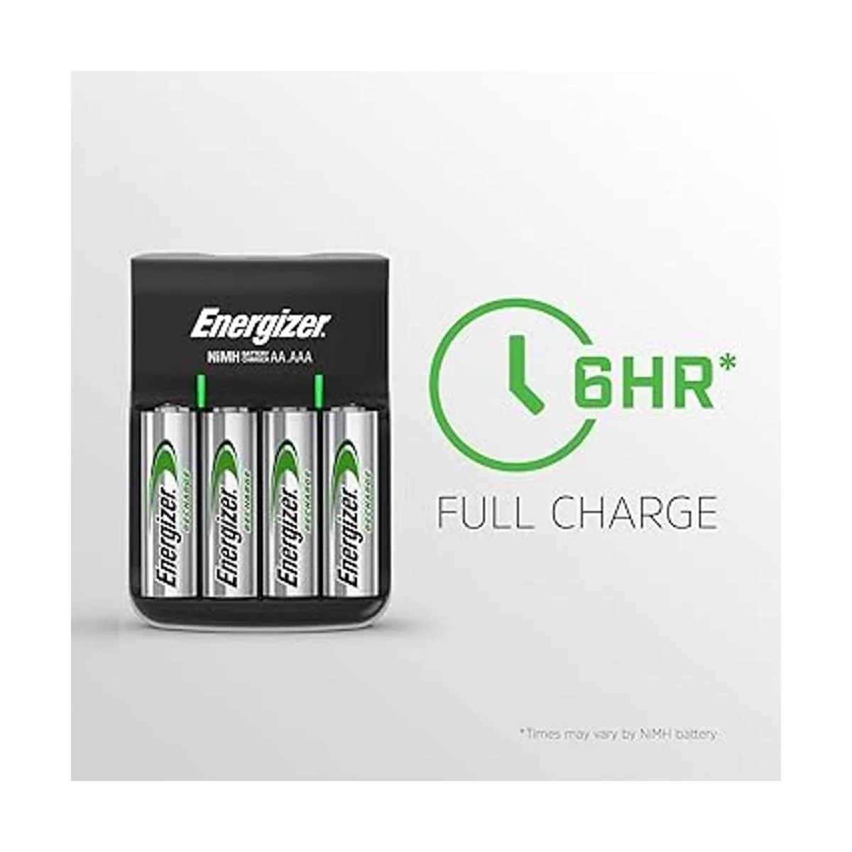 Un cargador de batería básico Energizer para baterías AA y AAA con dos 2 baterías AA recargables Energizer y un cable USB para cargar
