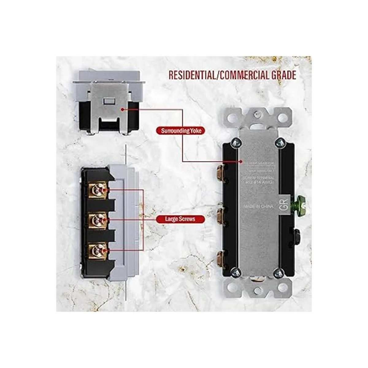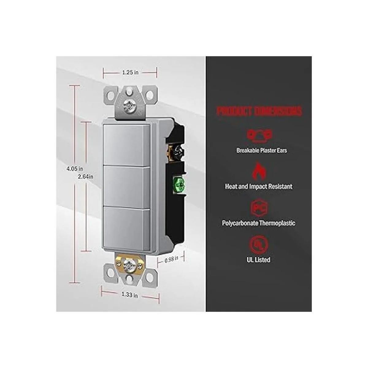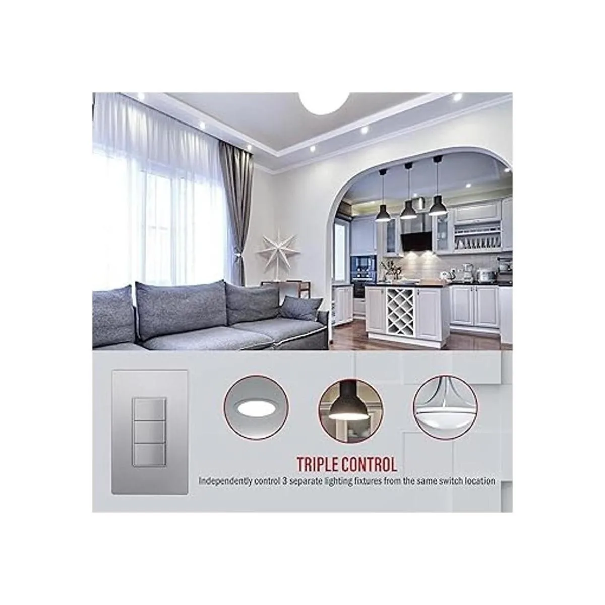 El interruptor de luz de paleta triple de grado residencial permite el control de tres accesorios desde un lugar. Hecho de materiales de alta calidad; policarbonato termoplástico resistente a los impactos