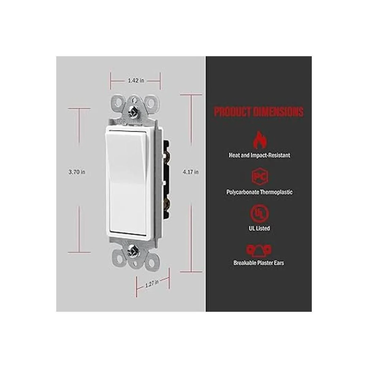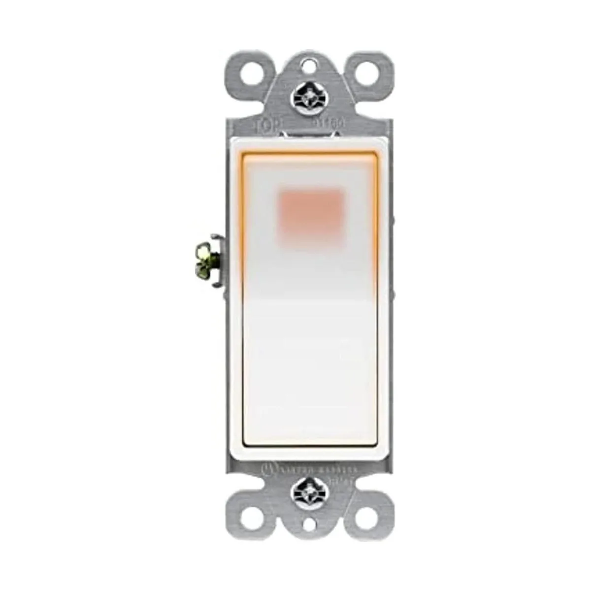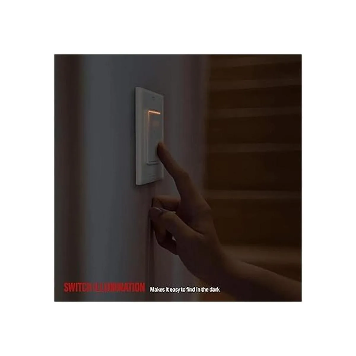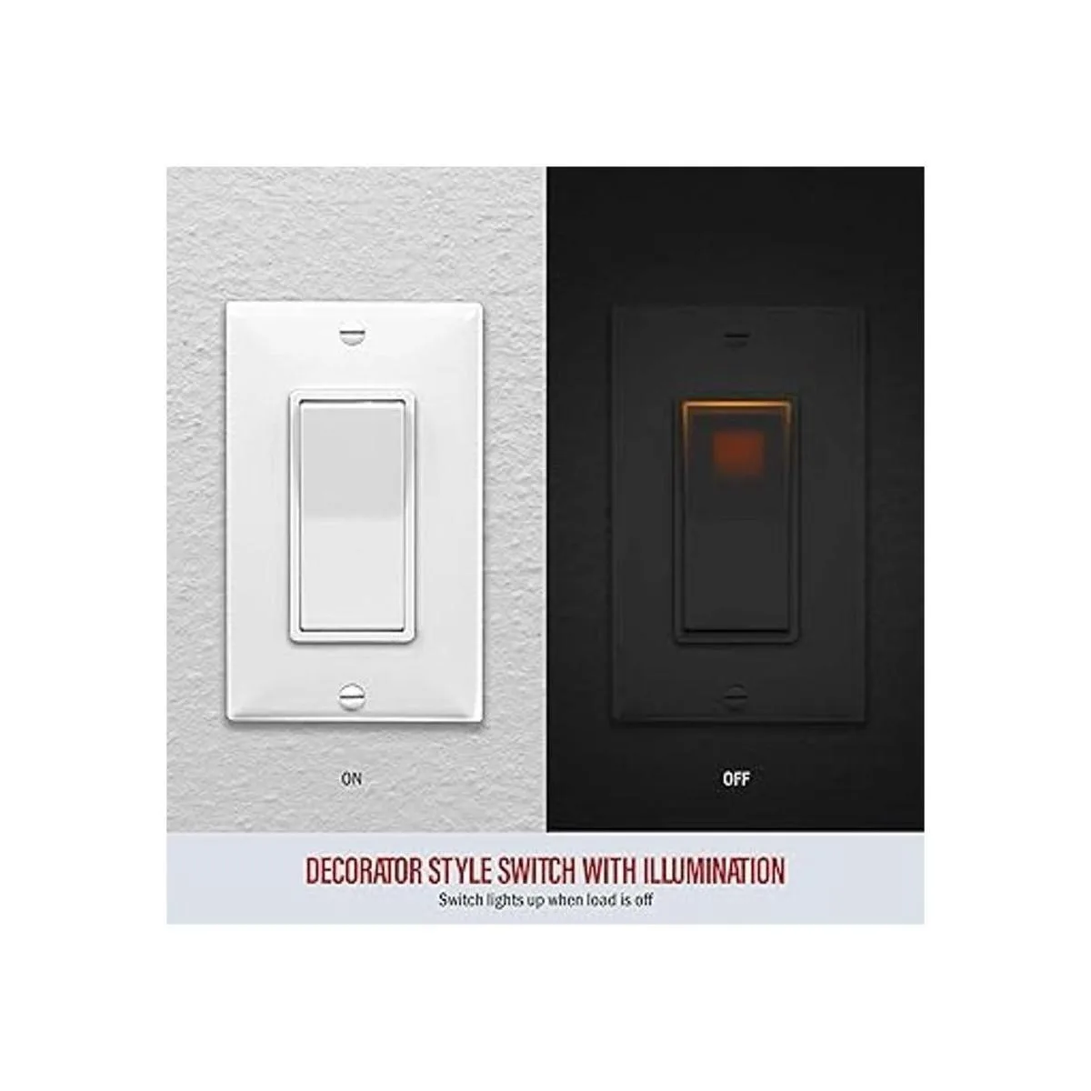 Interruptor de estilo decorador con iluminación; el interruptor se ilumina cuando la carga está apagada; construcción duradera hecha de policarbonato termoplástico de alta calidad resistente a los impactos y acero sólido