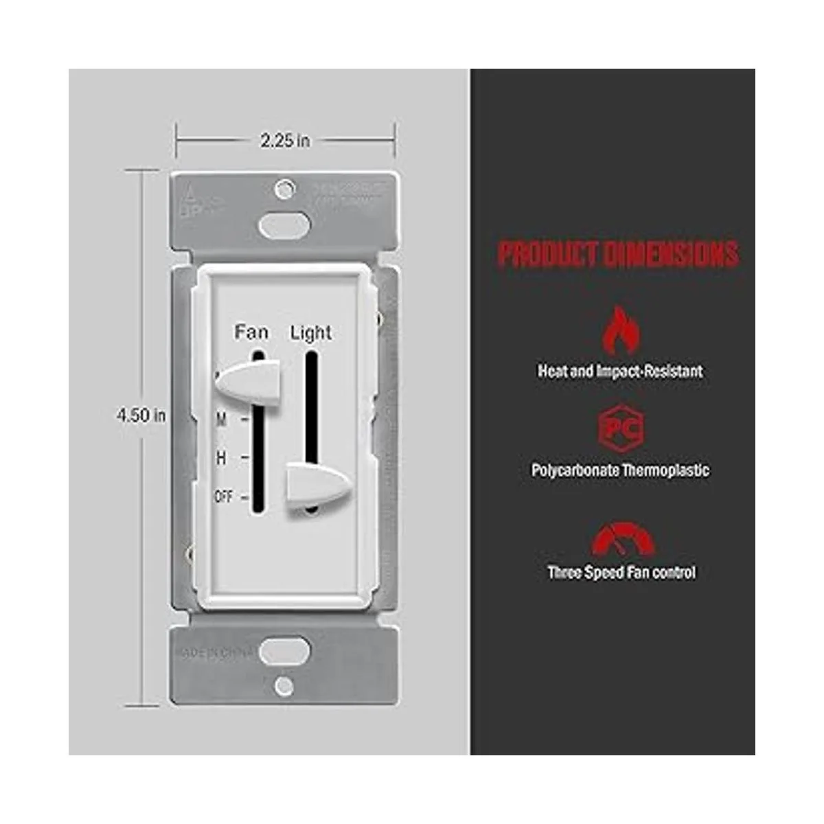 ENERLITES Interruptor de luz LED con regulador de intensidad y control de ventilador de techo de 3 velocidades, interruptor de ventilador de luz de un solo polo de 2,5 A, carga incandescente de 300 W, no requiere cable neutro, 17001F3W, color blanco