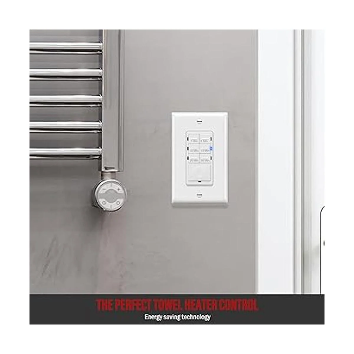 Interruptor de temporizador de baño con cable neutro requerido. Incandescente: 800 W. Fluorescente: 800 VA. Motor: 1/4 HP. Solo polo. Placa de pared incluida.