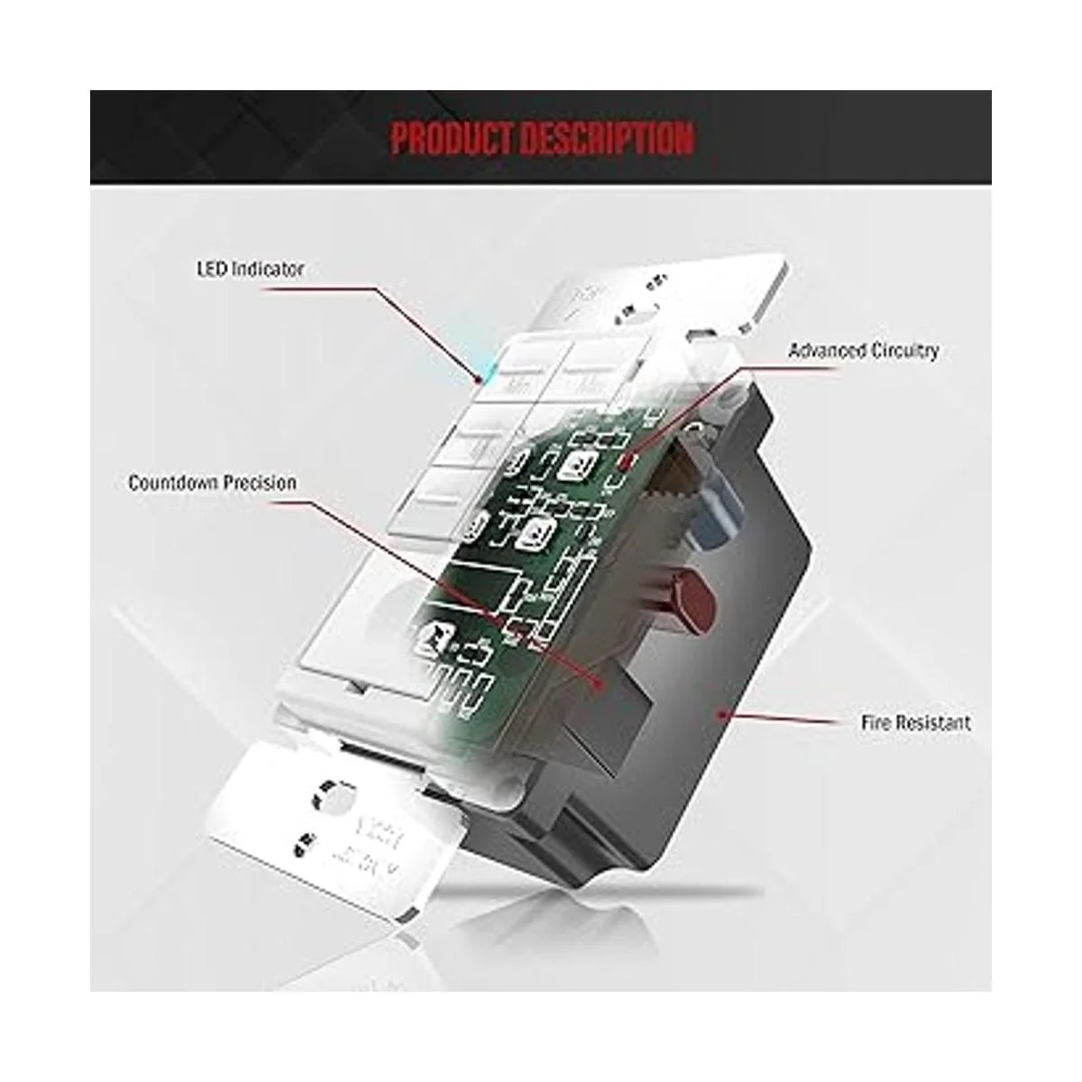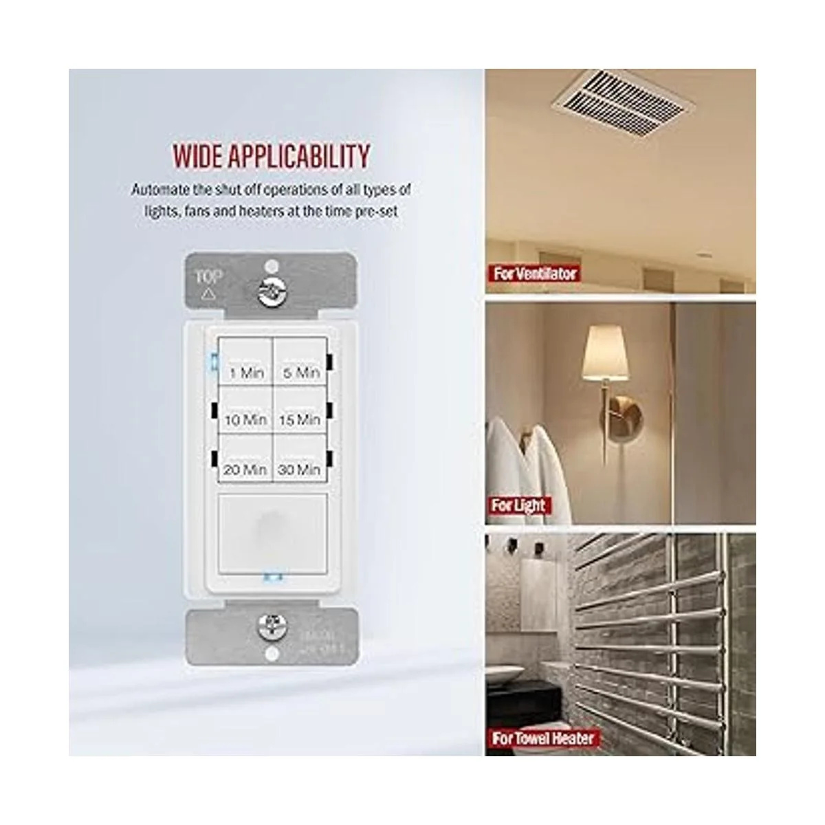 El temporizador de cuenta regresiva en la pared apaga automáticamente todos los tipos de ventiladores de ventilación, ventiladores de techo, motores y luces, incluyendo LED/CFL en el momento que configuras. Ahorra energía y nunca dejes las luces y el ventilador encendidos más tiempo de lo necesario.
