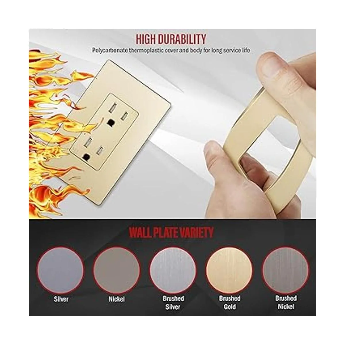 La tapa de contacto tiene un acabado metálico de brillo suave y mate; eleva la elegancia en tu espacio con una placa de pared metálica lisa a juego, incluida
