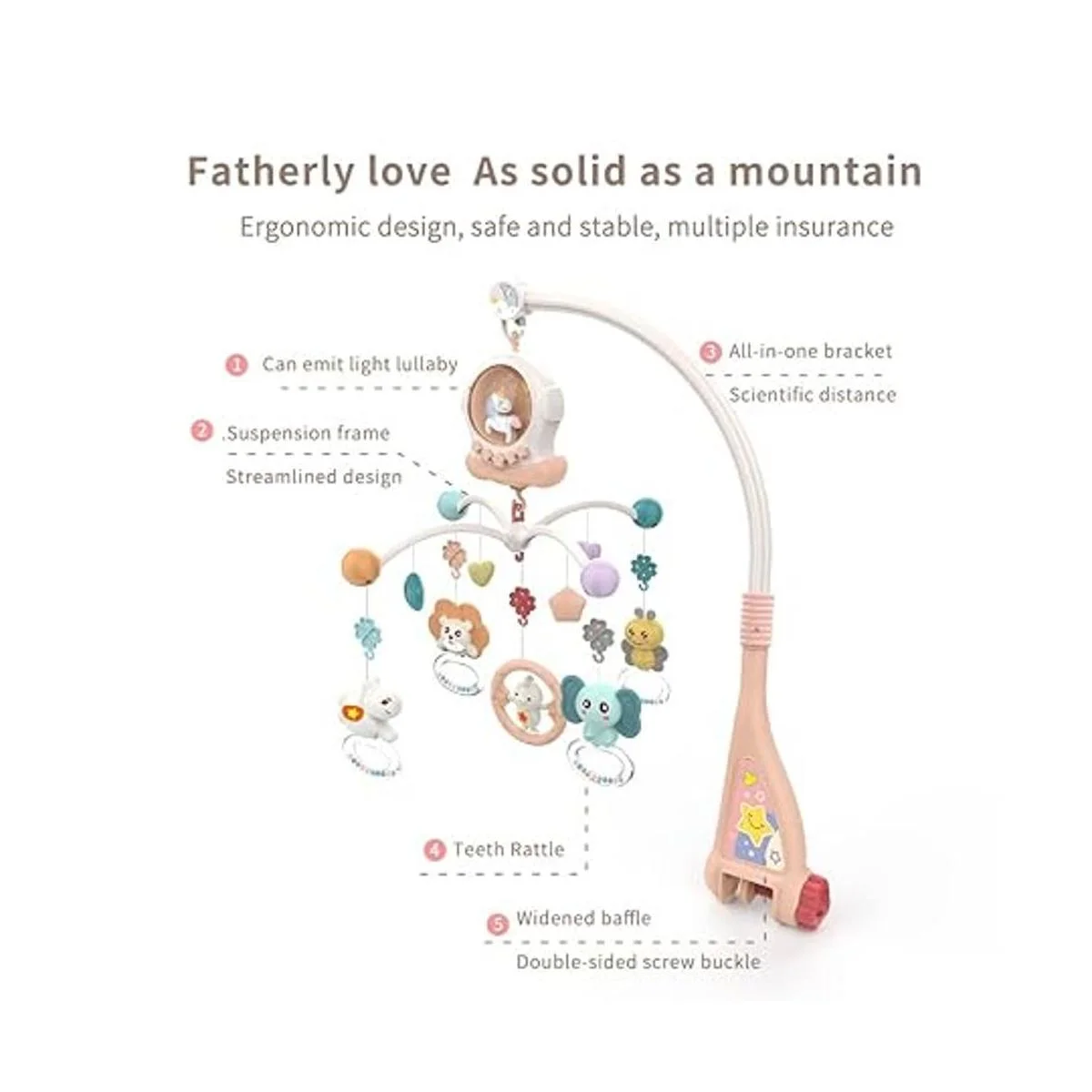 Diseño ergonómico: el diseño del móvil de la cuna es tan seguro y estable como el amor del padre. Su soporte tiene espacio científico. Su marco de suspensión adopta un diseño aerodinámico. Su deflector está ampliado y hebilla de tornillo de doble cara, que puede evitar resbalones y caídas. Estos proporcionan múltiples seguros para la seguridad del bebé.