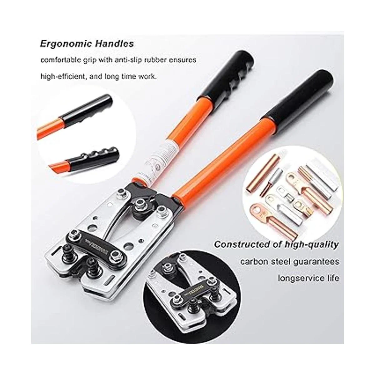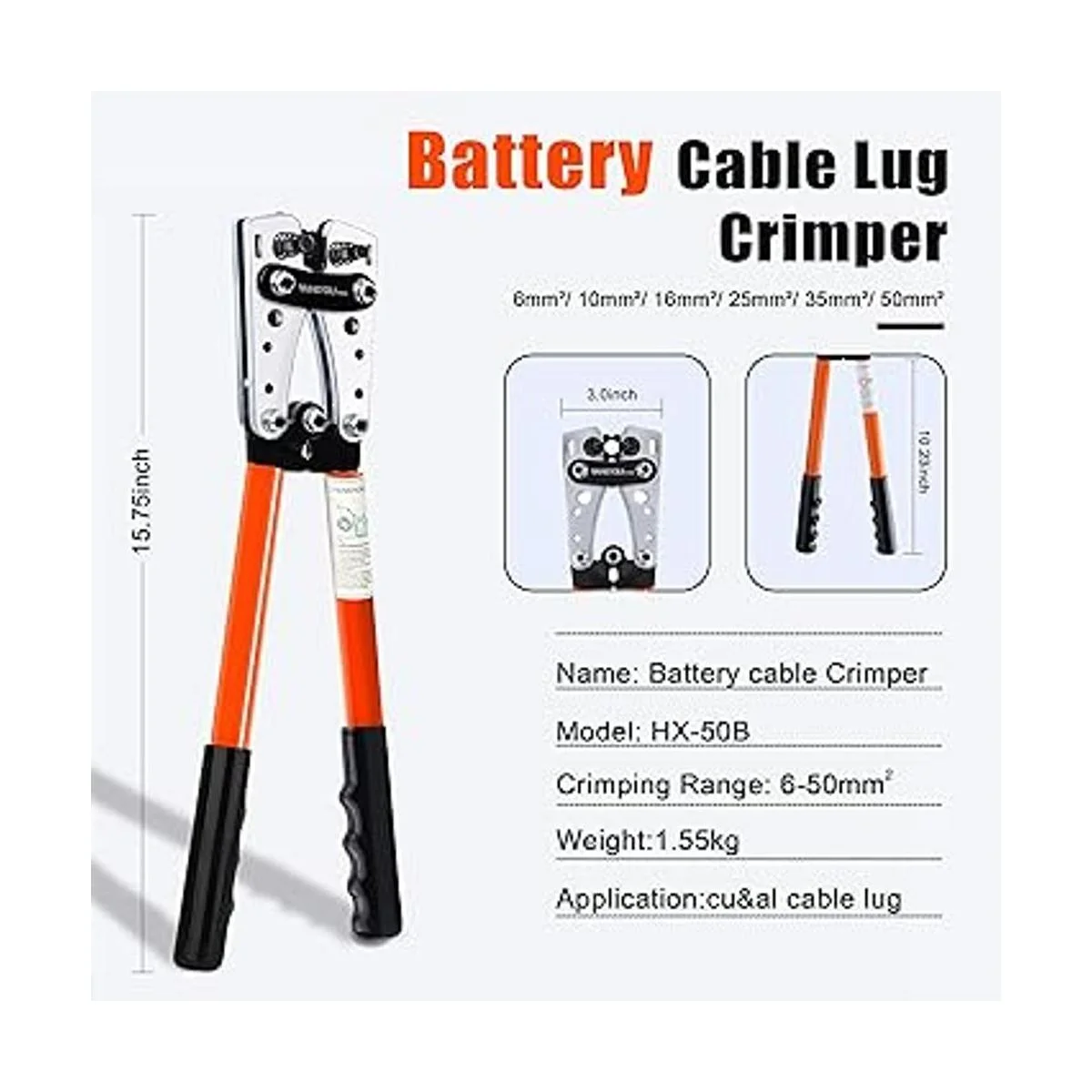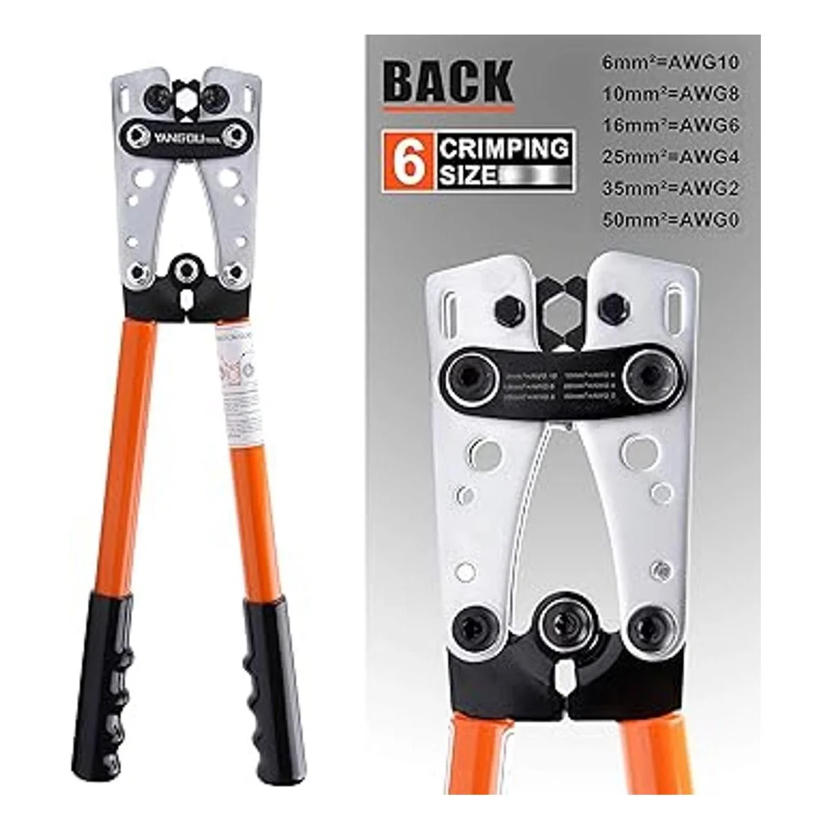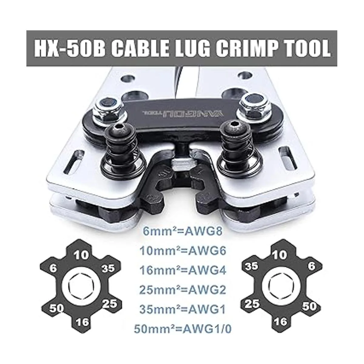 Troqueles de crimpado giratorios: el crimpador de cable de batería tiene 6 troqueles para terminales y cables de calibre 10/8/6/4/2/0 6 mm/10 mm/16 mm/25 mm/35 mm/50 mm, utilizando cabezales giratorios con un pasador de bloqueo con resorte para ajustar el tamaño.