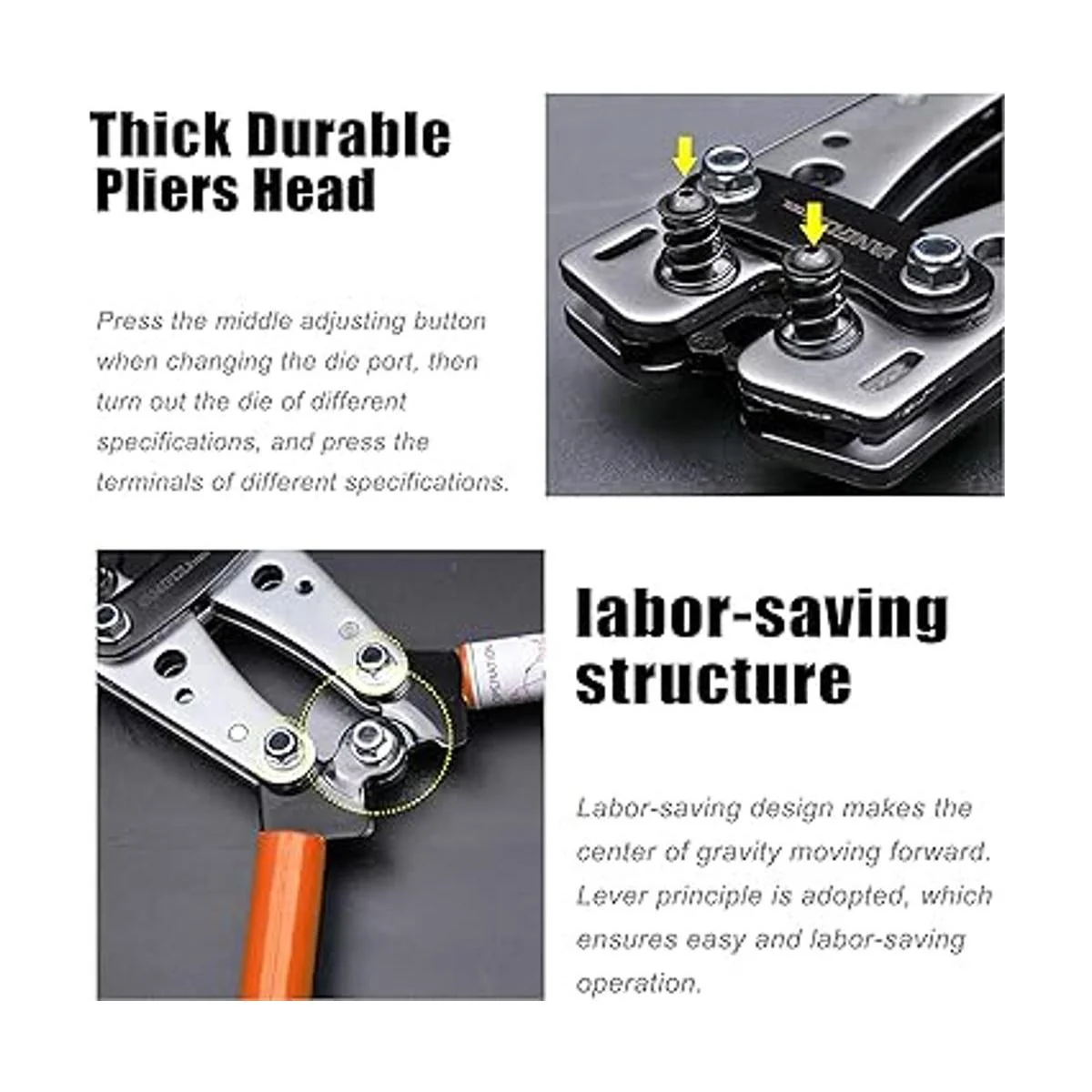 Fácil operación: presiona el tornillo y gira los troqueles al tamaño que necesites, luego simplemente tira fuerte de la crimpadora de terminales de alambre de trinquete y luego produce un buen crimpado en las lengetas del cable.