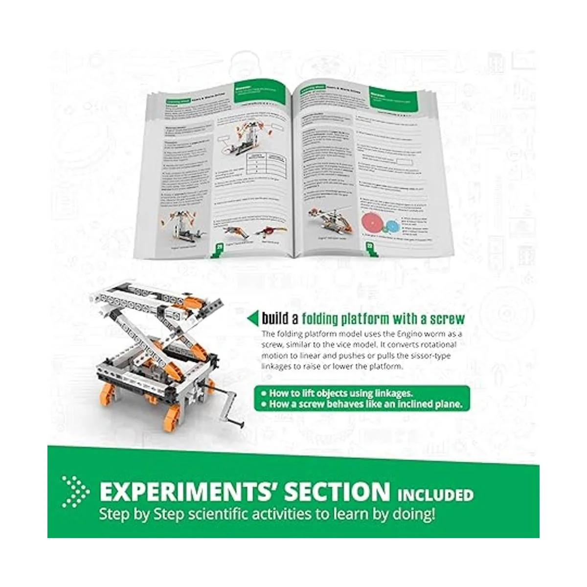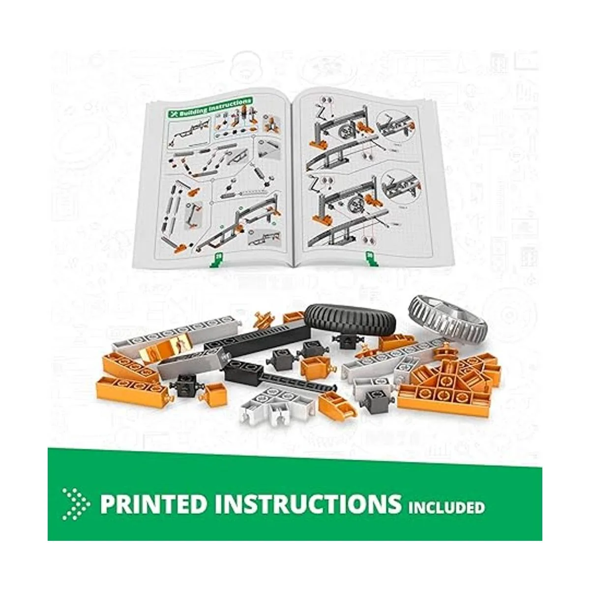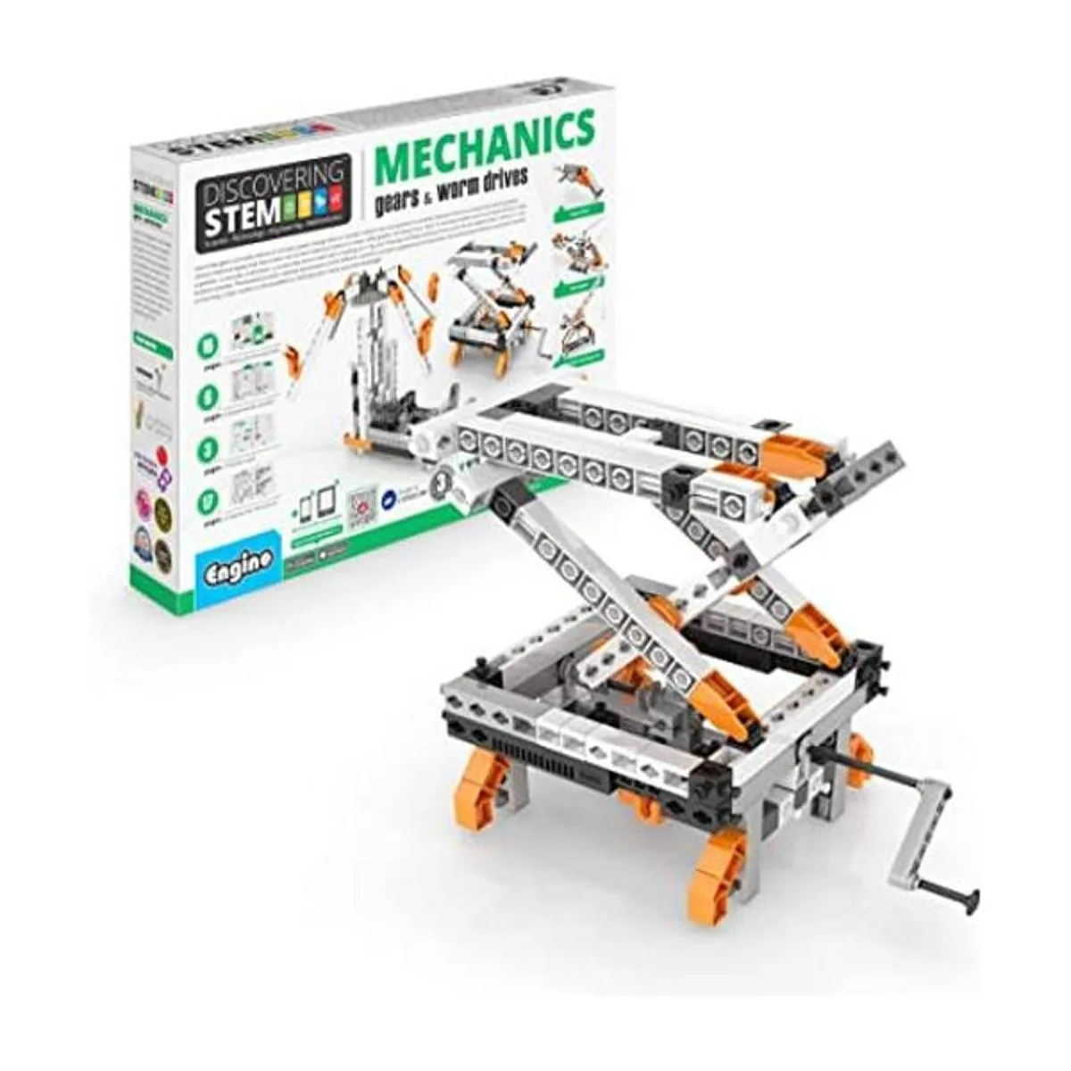 Los niños aprenden cómo los engranajes pueden reducir o aumentar la velocidad y aprender cómo se utilizan las unidades de gusano para cambiar la velocidad de rotación. Construye 12 modelos de trabajo como una grúa experimental, un helicóptero, una caja de cambios y mucho más.