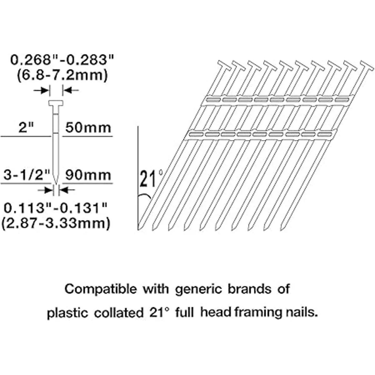 Utiliza clavos a 21 grados que van en tamaño de 2 a 3.5 pulgadas con cabeza de plástico.
