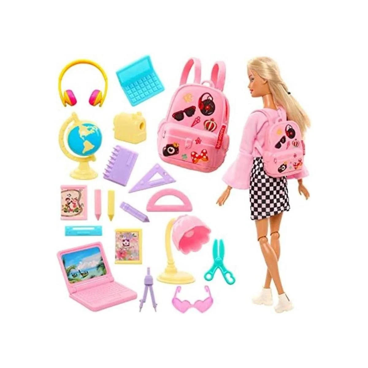 ENOCHT 19 piezas de accesorios escolares para muñecas de niña, mini mochila de muñeca, mini lámpara de escritorio, portátil, mini globo gafas y auriculares para muñecas escolares de 11.5 pulgadas