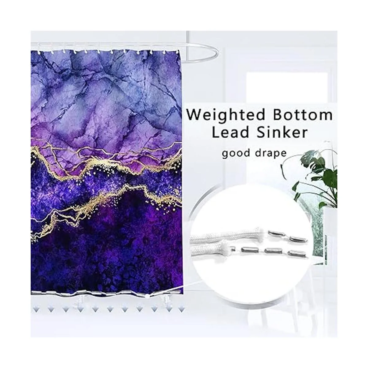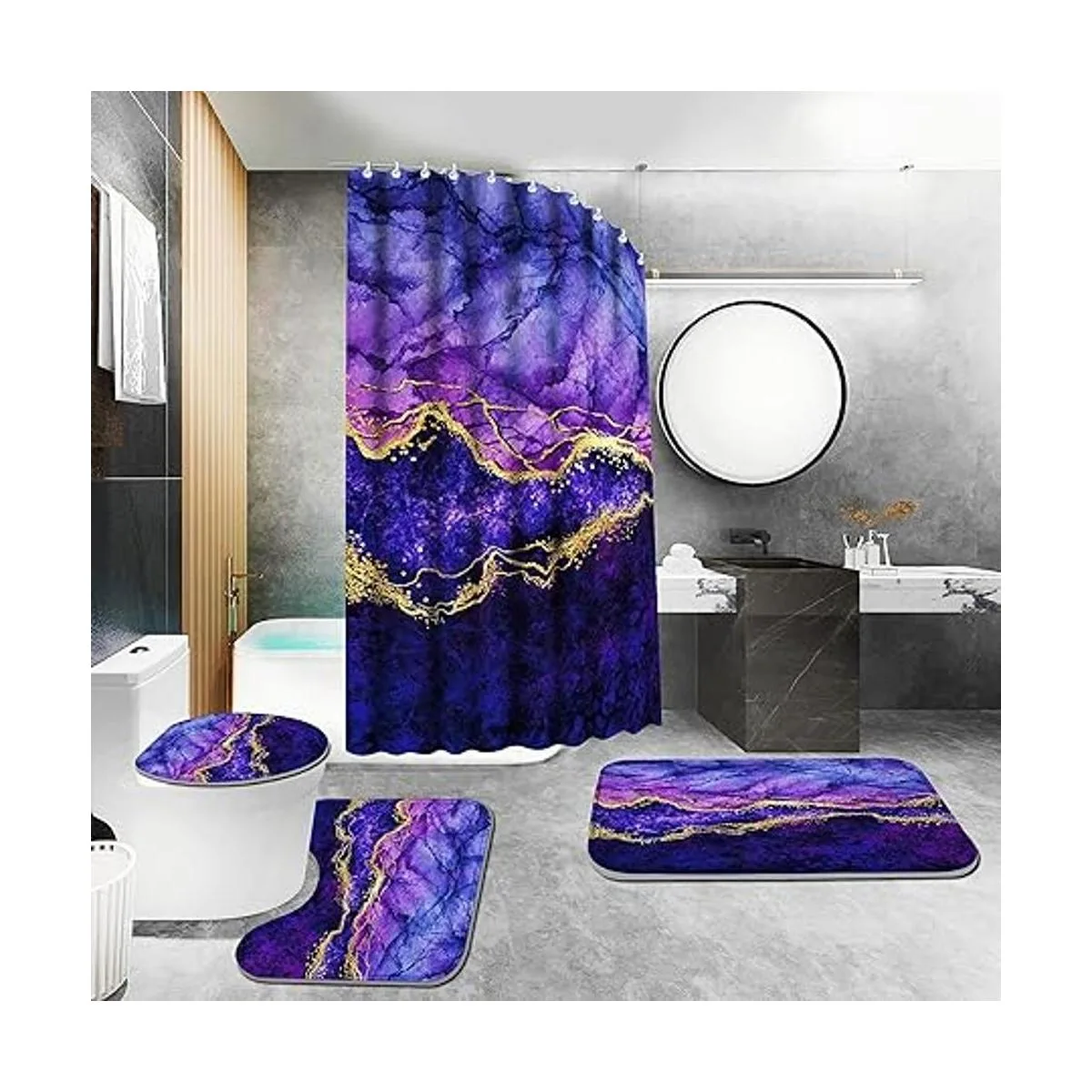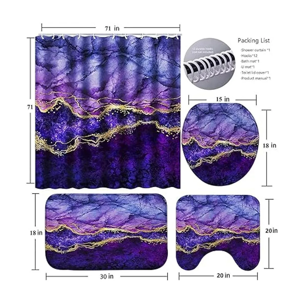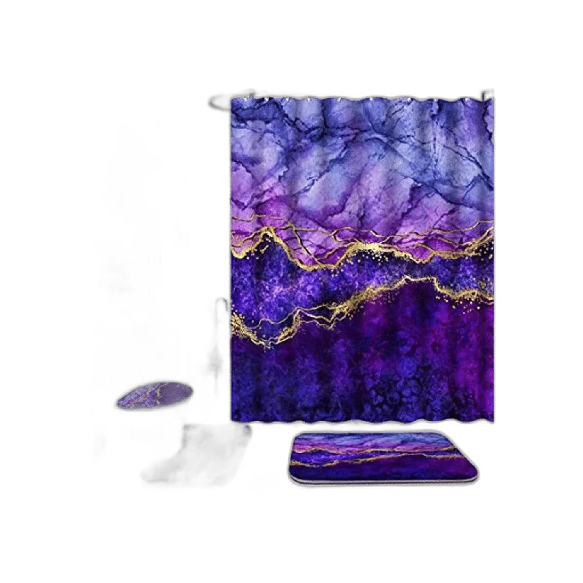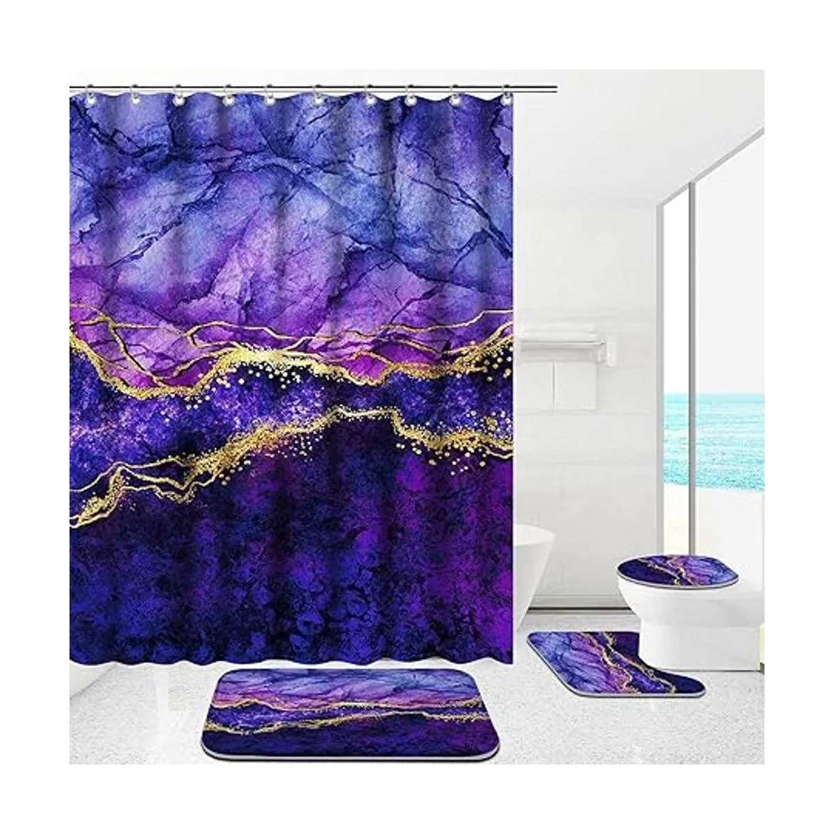 ENYORSEL Juego de cortina de ducha de baño con alfombras, juego de baño de mármol dorado y morado con juego avanzado de cortina de ducha y 12 ganchos, tapete de baño suave y antideslizante, tapete en forma de U para inodoro y cubierta de tapa de inodoro