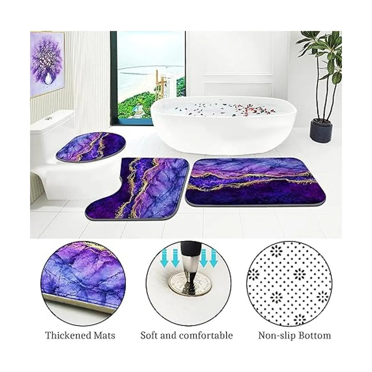 Material mejorado: la lujosa cortina de ducha está hecha de tela 100 poliéster, peso de plomo integrado, que es impermeable y tiene una excelente caída, y se siente gruesa; el juego de alfombras de baño y la cubierta de la tapa del inodoro están hechos de franela de alta calidad y espuma viscoelástica, que son extremadamente suaves y cómodas. Diseño antideslizante no tejido, ya no te preocupes por resbalones.