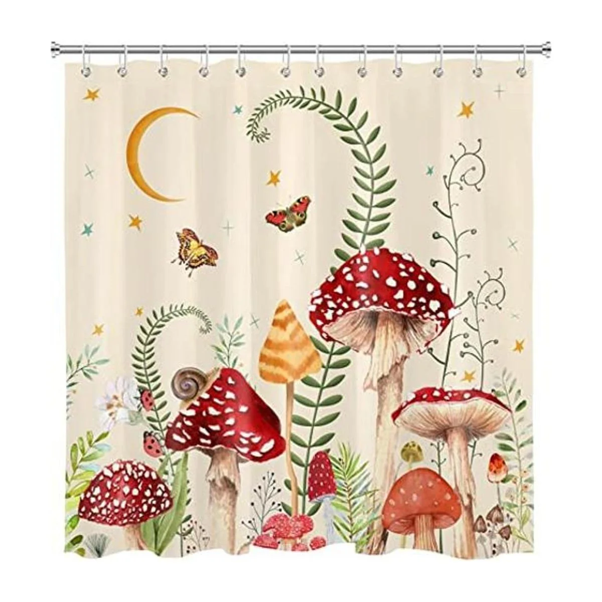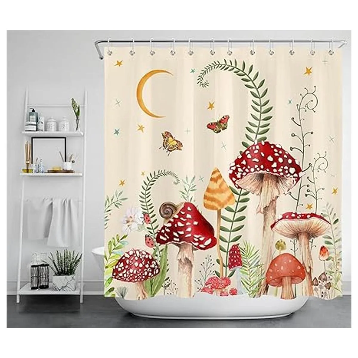 EOBTAIN Cortina de ducha con hongos retro, diseño de mariposas, floral, boho, luna, estrellas, flores silvestres botánicos, plantas verdes, cortina de baño estética, tela impermeable, duradera, lavable con 12 ganchos