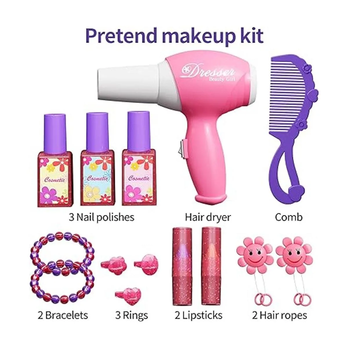 Kids Dress Up Pretend Play Girls Vanity Set Toddler girls makeup table with chair. Beauty makeup kit include: 3 rings, 3 nail polishes, 2 hair ropes, 2 pearl bracelets, lipstick and lip gloss, 1 comb and 1 real working hair dryer. Total need 41.5V AA batteries not included